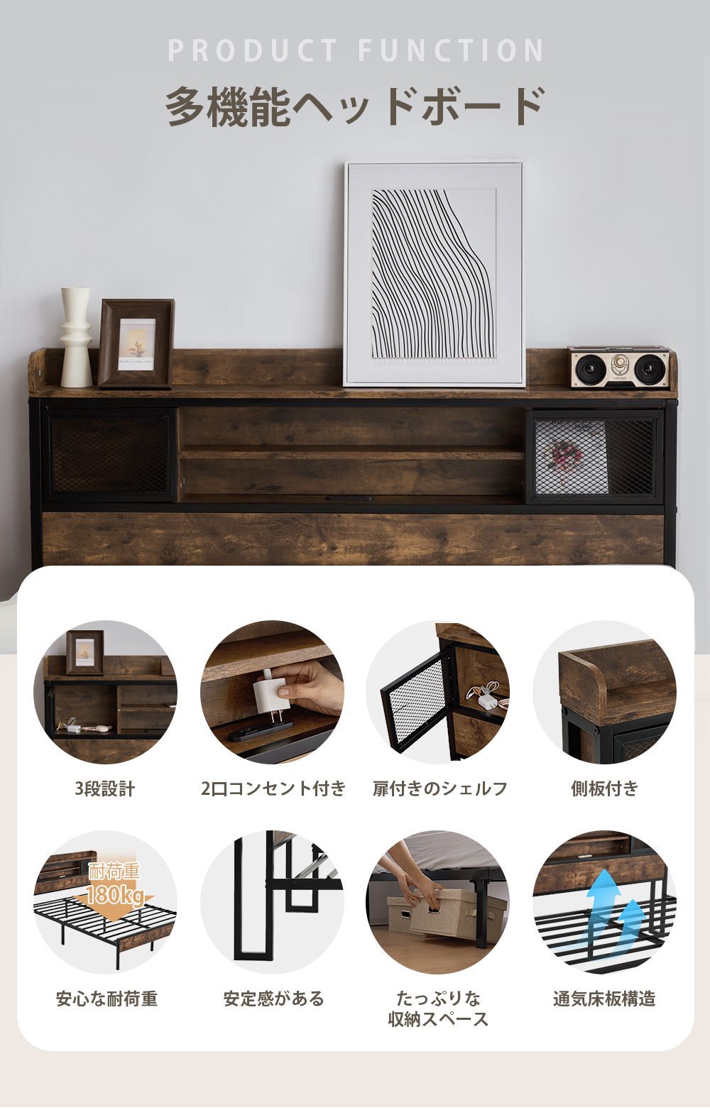 ベッドフレーム ベッド セミダブルベッド パイプベッド ベットフレーム 収納付き ローベッド コンセント シェルフ 宮付き ヘッドボード 耐震 頑丈