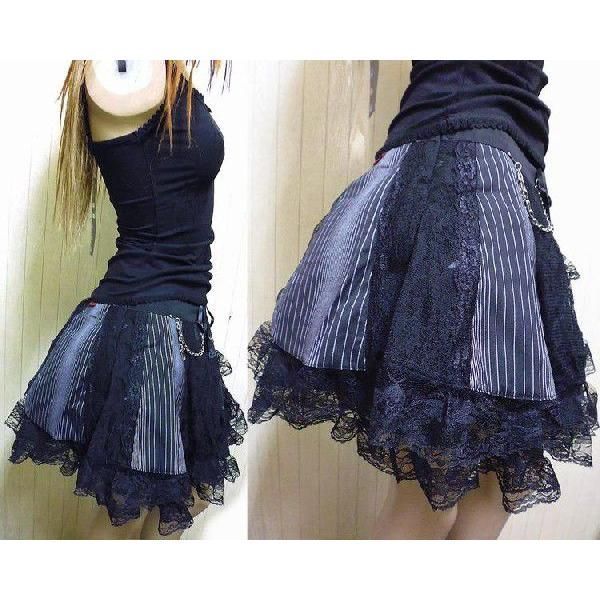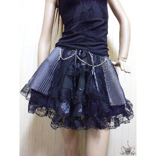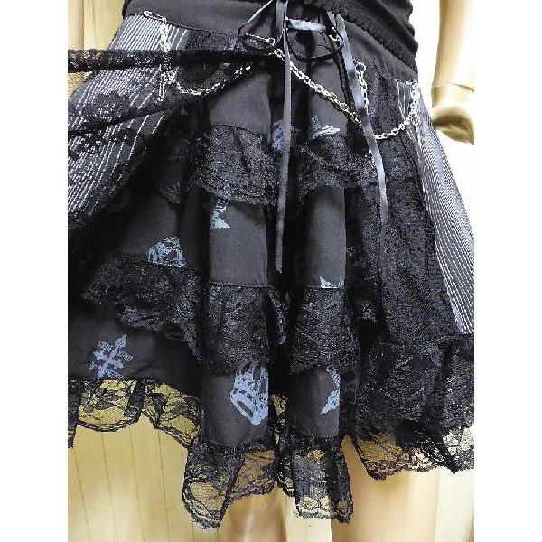 クラウン柄と十字架のティアードスカートの上にピンストライプ柄とレースの生地がラップスカートのように外側を覆い、中央はレースアップして、ウェスト調節が可能、右サイドにジップ、十字架&チェーンのチャームは取り外し可能。裏地⇒硬チュール⇒柄入りティアード⇒ピンストライプ。