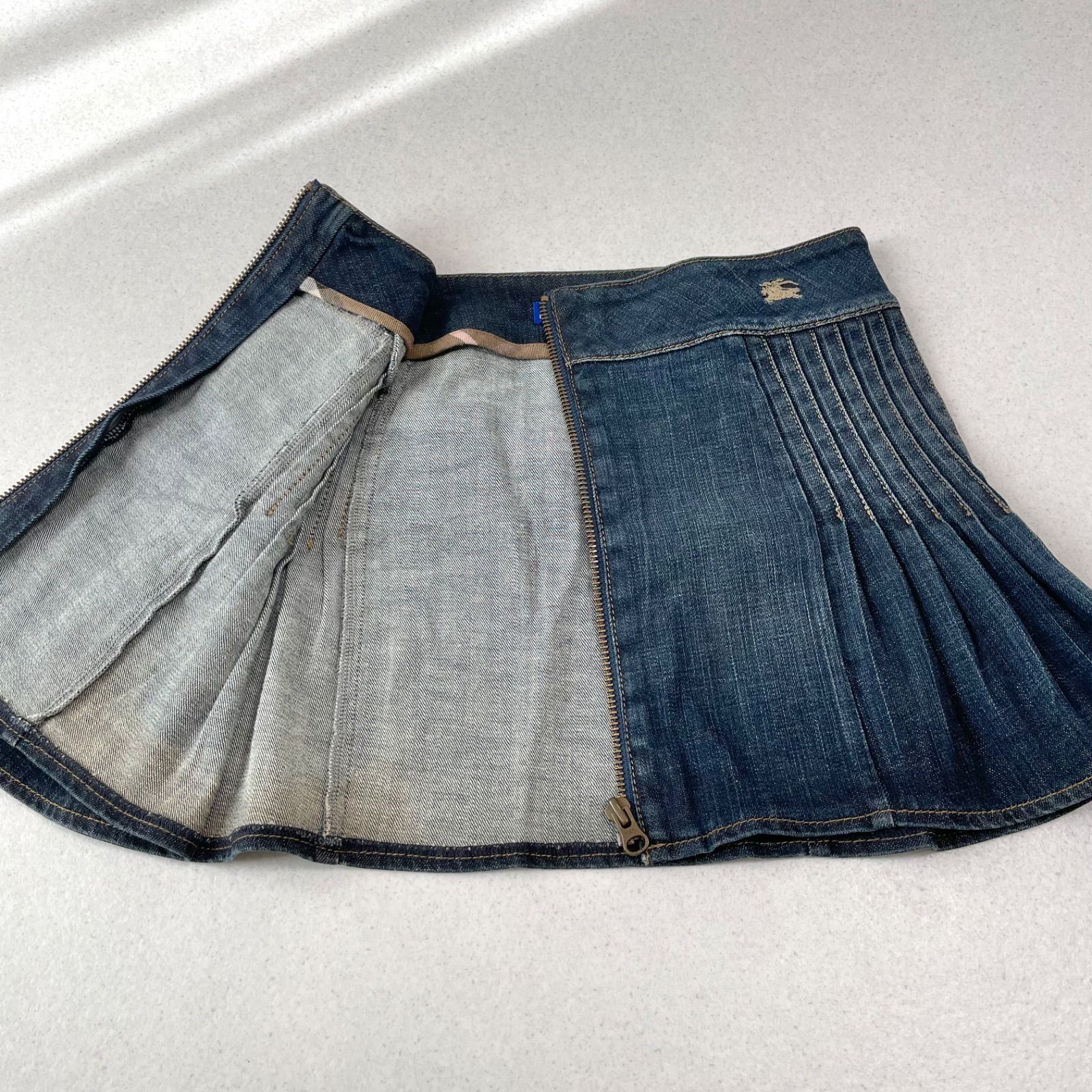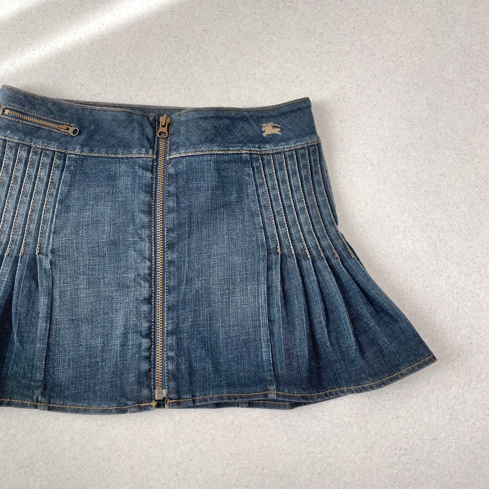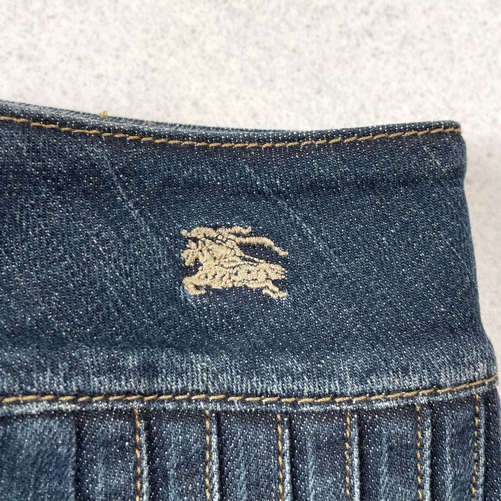 Y2K バーバリーブルーレーベル ギミック ホースロゴ刺繍 ベルト タック デニム プリーツ ミニスカート ストレッチあり 平成ギャル フェアリーグランジ BURBERRY BLUE LABEL