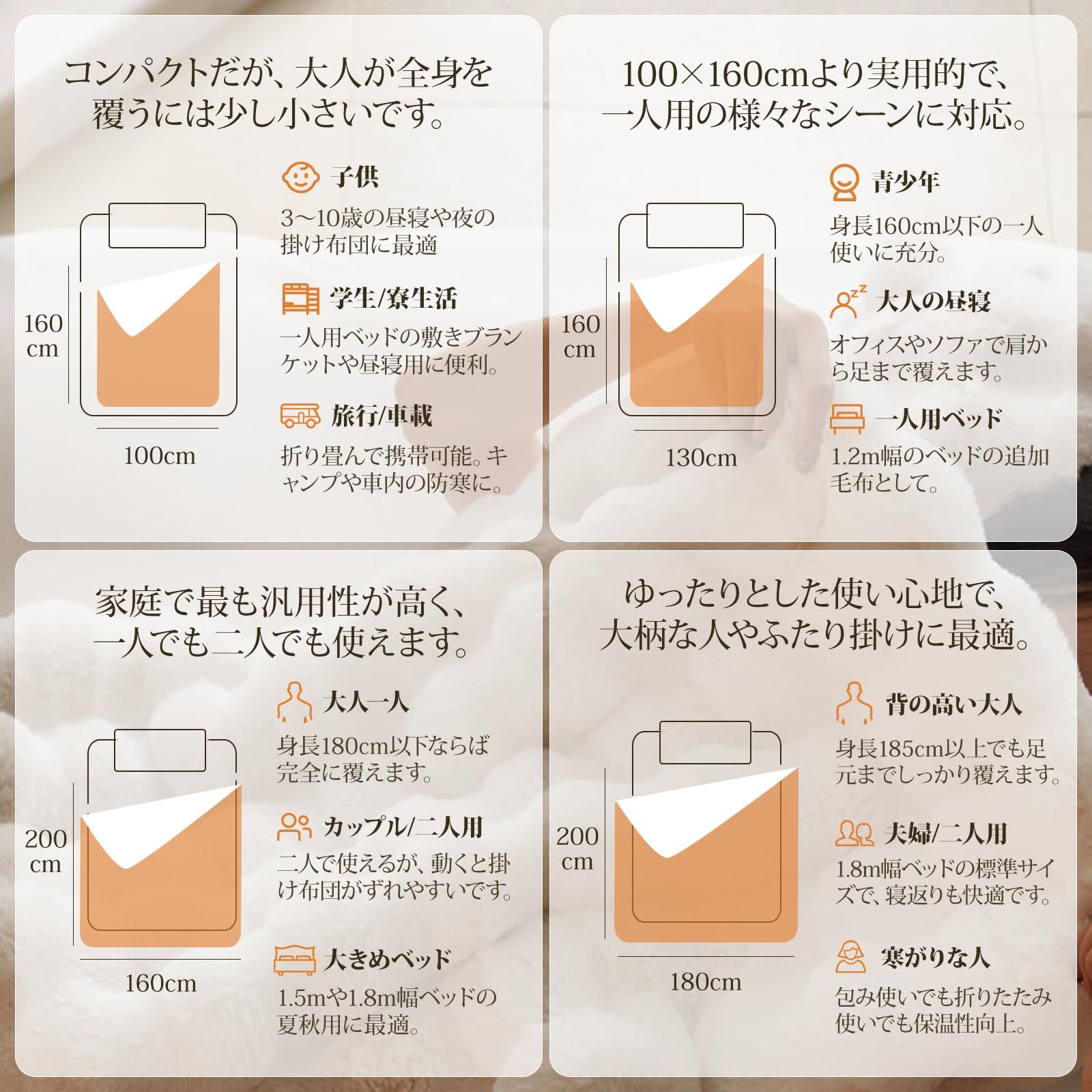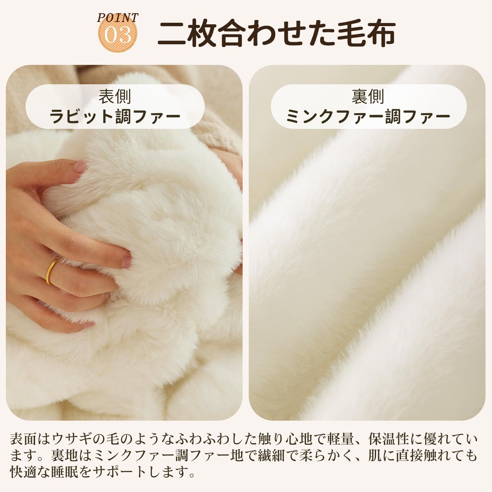 【贅沢な二層構造】表側はなめらかなラビットファー調、裏側はふかふかのミンクファー調に仕上げた特別な二枚合わせ毛布。両面異なる肌触りが楽しめながら、優れた保温性で寒い夜もぽかぽか。ふんわりと身体を包み込むような柔らかさで、心地よい安らぎをお届けします。カーペットは出荷前には日本国内にてしっかり検品を行っておりますので、ご安心ください。万が一カーペットに不具合がある場合は、1年間のが付いていますますので、お気軽に当店までご連絡ください。※お客様ご注意:カーペット輸送の際に折りたたんでお届けするため、開封時に折りジワ、歪み・寸法不足等の変形がありますが、一週間ほどご使用になれば、ゆっくりと回復します。製品サイズに個体差があるため表記サイズより1~3%の誤差がある場合がございます。