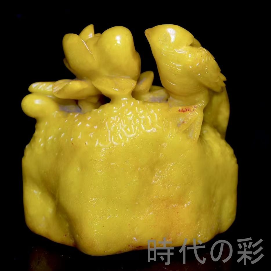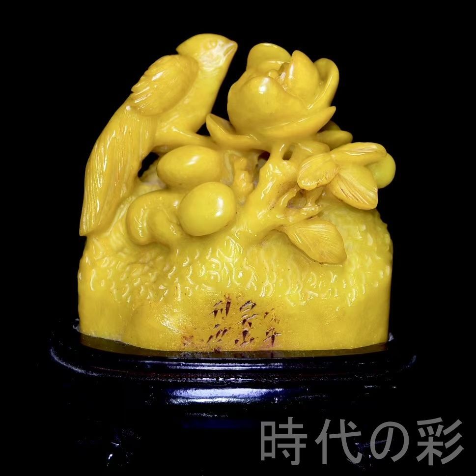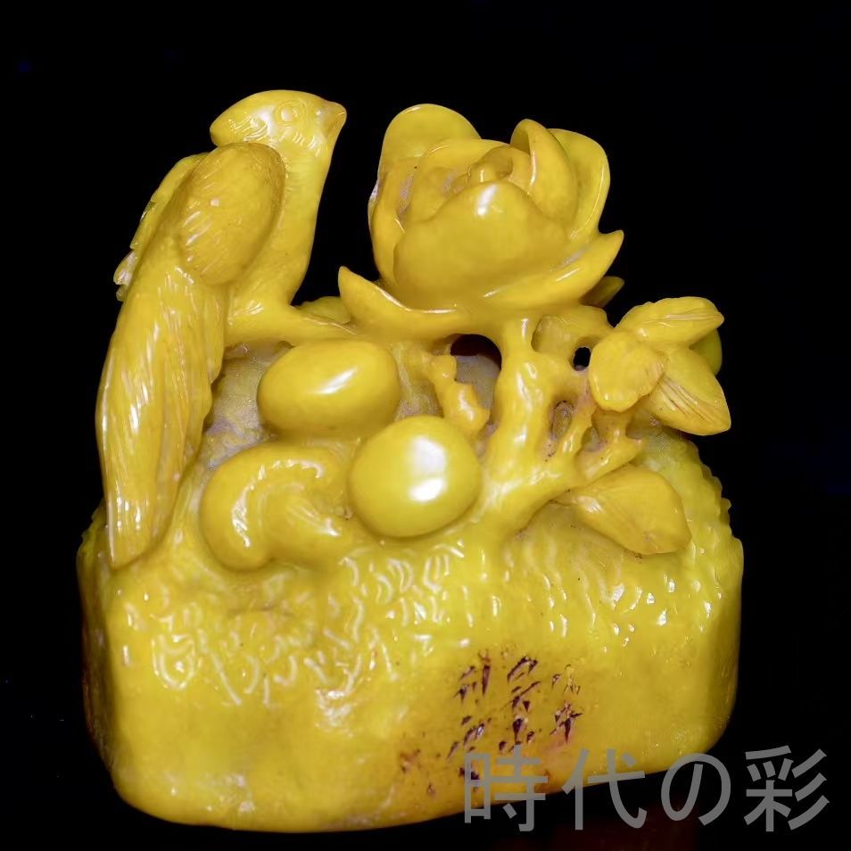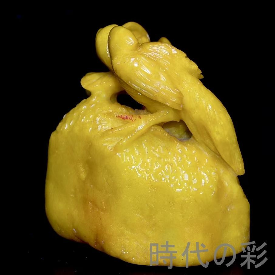 旧蔵の寿山田黄石置物。石質は油潤通透で、血絲紋が非常に鮮明。彫刻は細密で、【?山】刊石とされる収蔵佳品。重量感もあり、存在感の強い逸品。