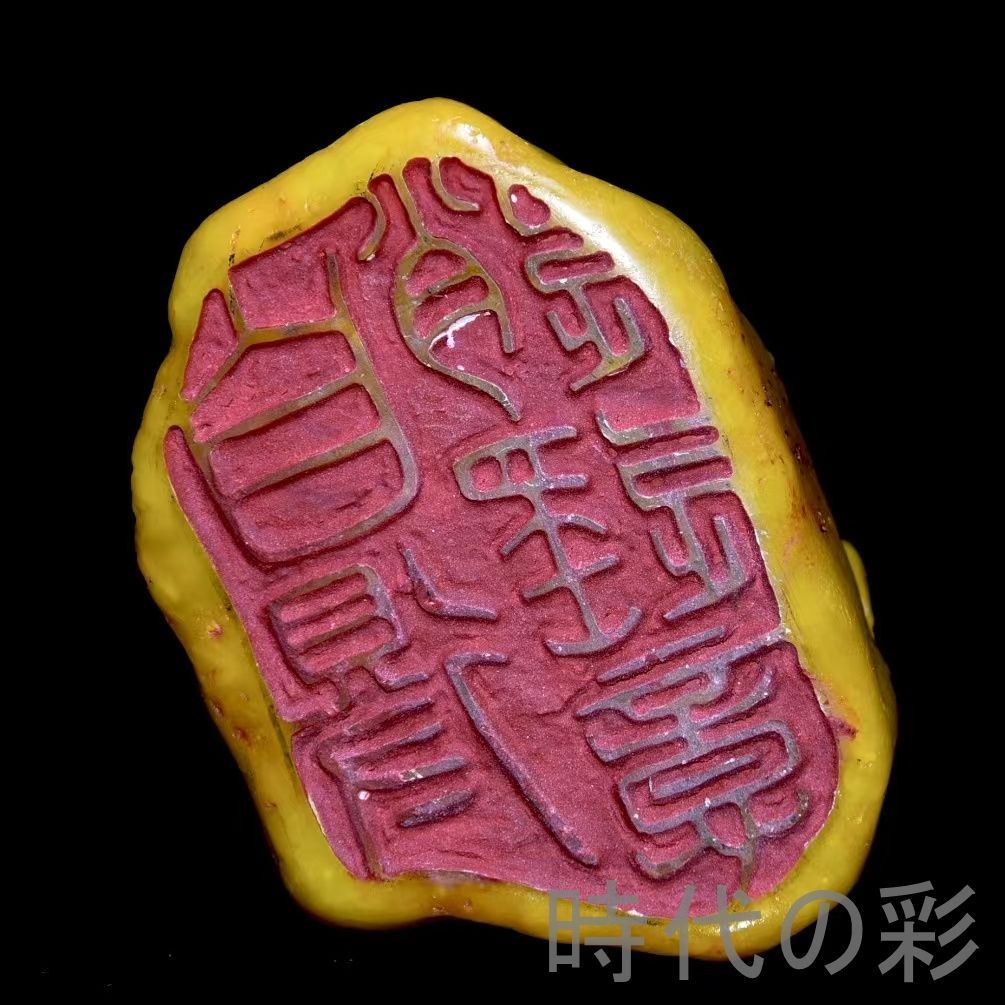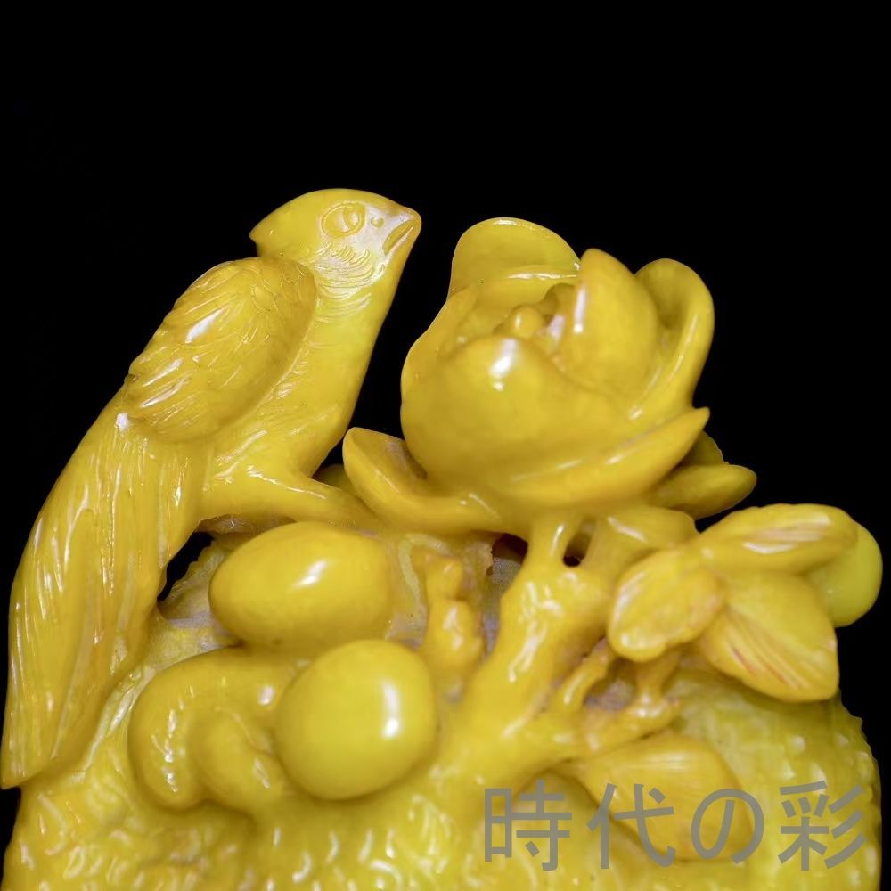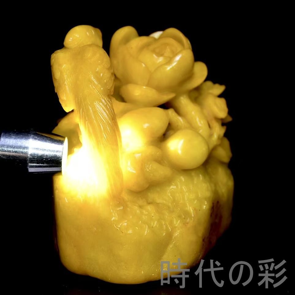 旧蔵の寿山田黄石置物。石質は油潤通透で、血絲紋が非常に鮮明。彫刻は細密で、【?山】刊石とされる収蔵佳品。重量感もあり、存在感の強い逸品。