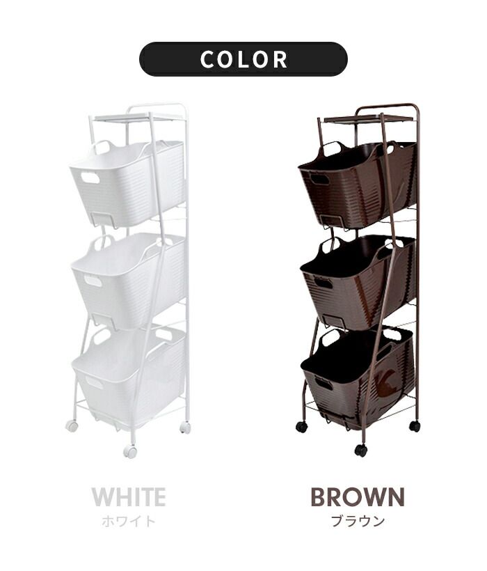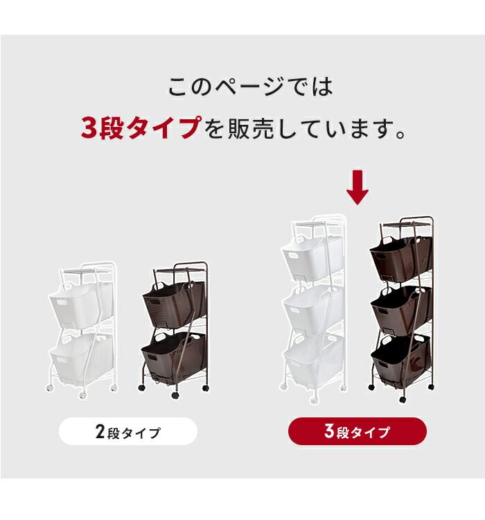 ソフトバスケットと丸パイプの曲線がやわらかな印象を与える、3段タイプのランドリーワゴンです。