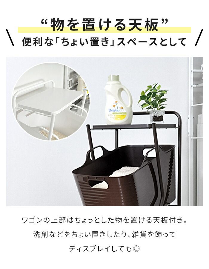 バスケットは斜め置き仕様のため、洗濯物の出し入れがしやすく、日常使いに配慮したデザイン。天板には洗剤や洗面まわりの小物を置くことができ、収納力と使い勝手を両立しています。キャスター付きで洗濯物の移動もスムーズ。たっぷり入るバスケットは丸洗い可能で、清潔にお使いいただけます。安心の日本製です。