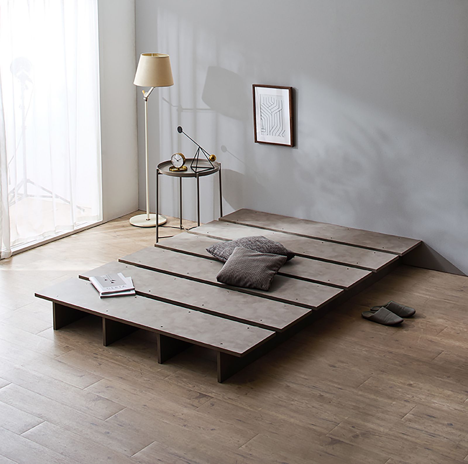 高さを抑えたフラットスタイルは開放感のある快適な空間を作り、ヘッドなどが無い分コンパクト。マットレスのサイズのワンランク上のフレームを合わせればサイドテーブルのような小物がおけるスペースに。コンパクトでありながら部屋に余裕が生まれます。