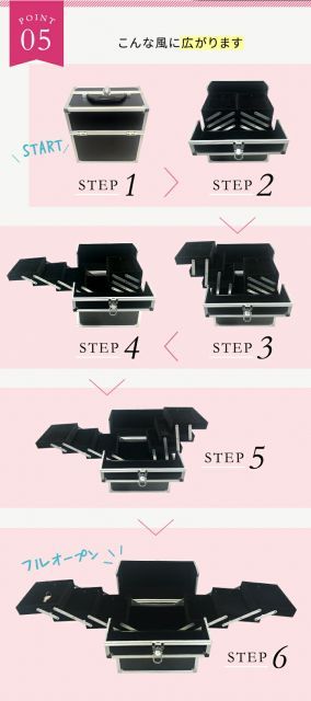 内部には左右に広がる6枚のトレイがついておりかさばる化粧道具をばっちり収納。