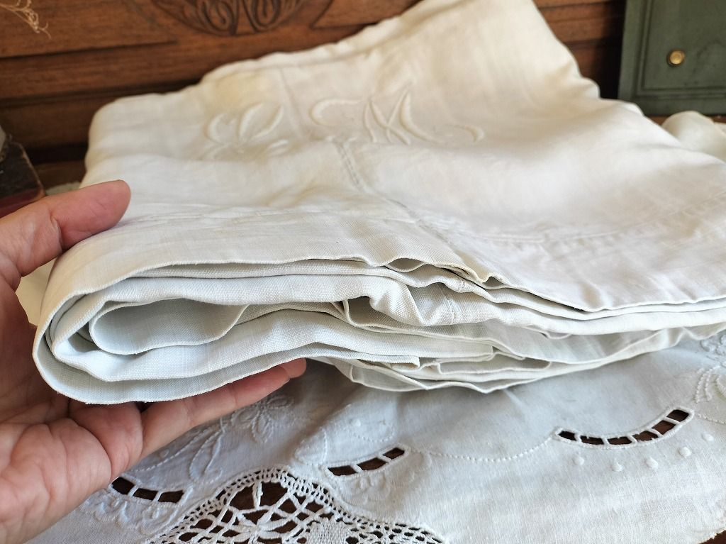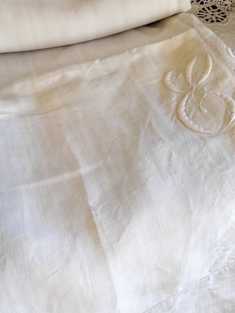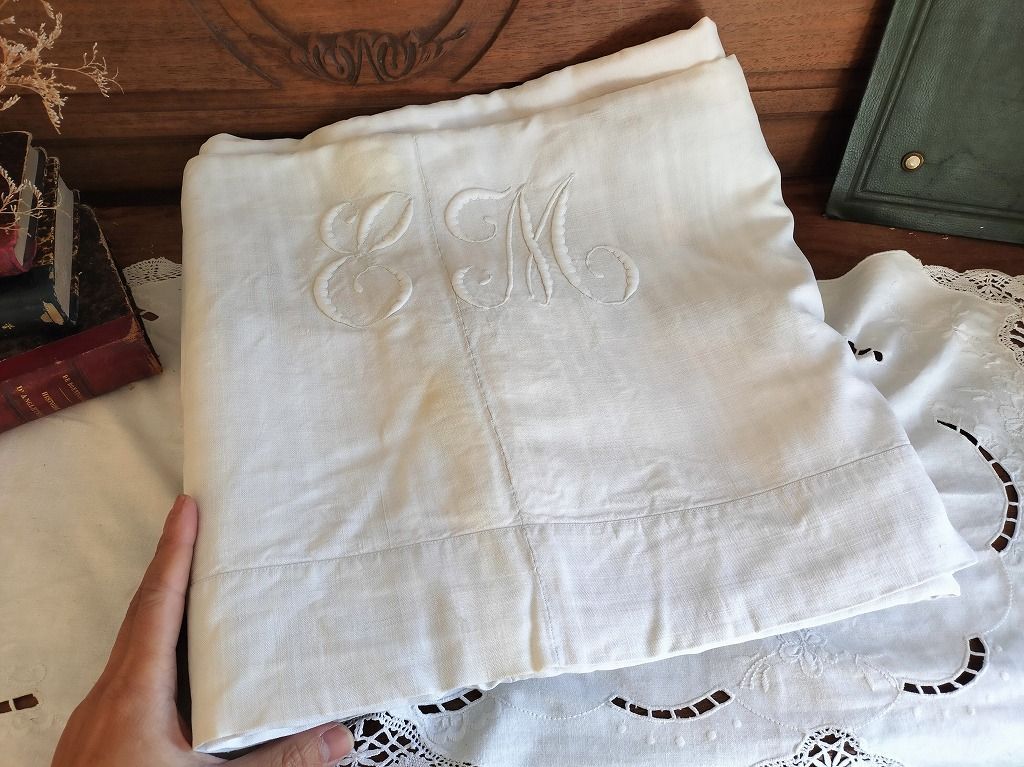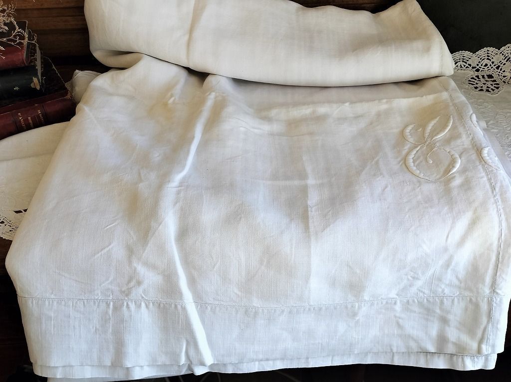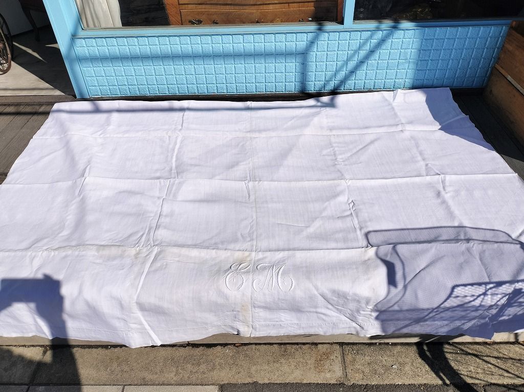 フランス アンティーク リネン 無地 シーツ モノグラム 刺繍 203 x290cm