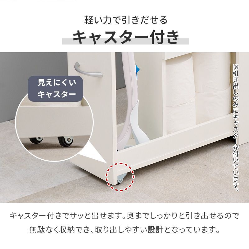 直径13㎝の太巻き対応。トイレットペーパーの補充や取り出しがしやすく、スリムなのに掃除用具もスッキリ片付くトイレラック