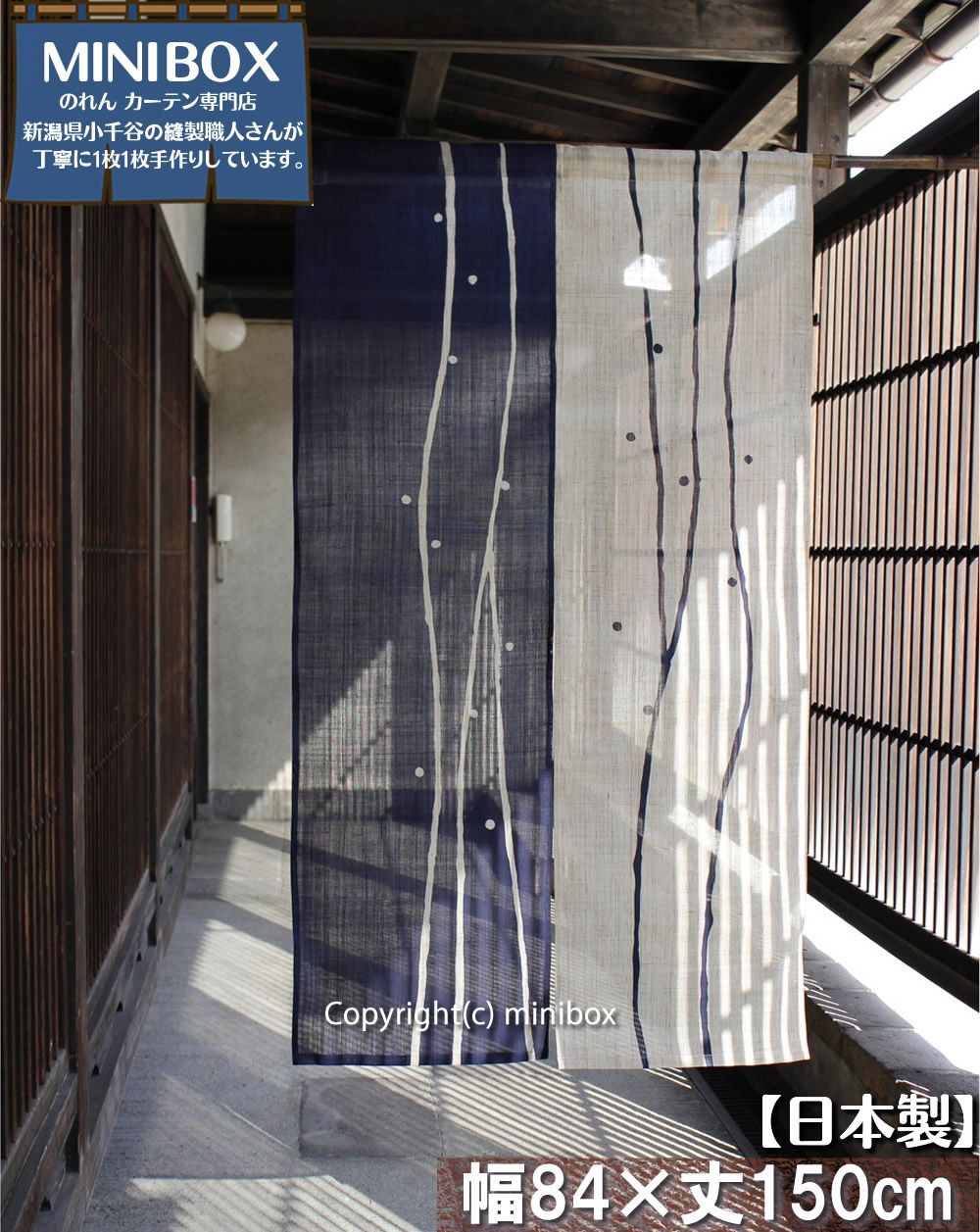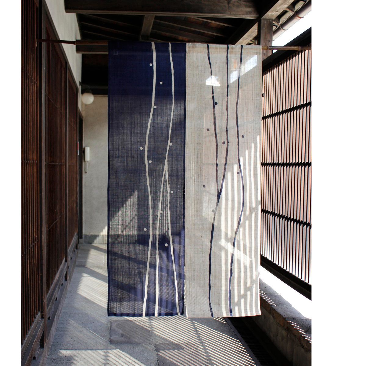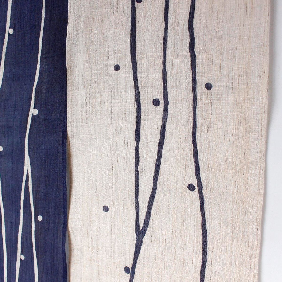 生成りと藍色の麻生地をベースに、シンプルでモダンな柄を配した麻のれんです。