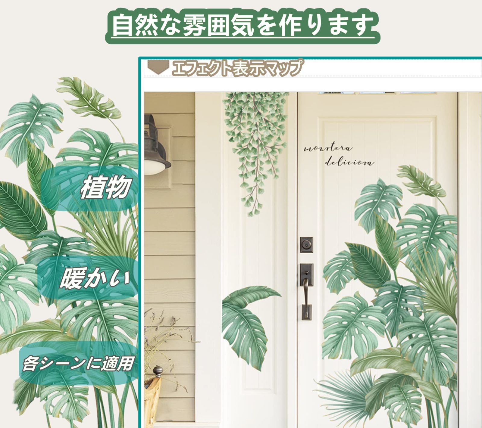 【多機能】お部屋、バスルーム、リビング、ダイニング、通路、玄関などのフラットな場所に取り付け可能! 屋内の3Dアートの壁紙ですが、緑の植物を家に簡単に埋め込んで、人生に多くの活力と喜びをもたらすことができます。 学校や幼稚園の教室の飾りとして自然な雰囲気を演出することもできますし、もちろんお友達やお年寄りへのプレゼントとしてもお使いいただけます。