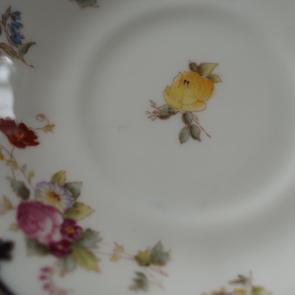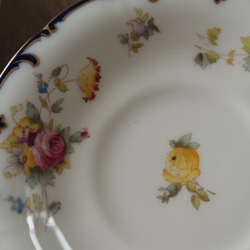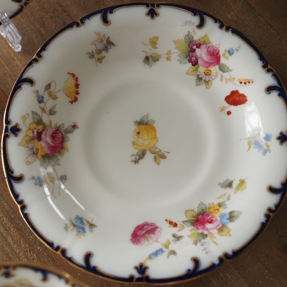 カップ、ソーサーすべてに、可憐なローズやデイジー、小花が細やかに描かれ、当時のハンドペイントらしい表情豊かな筆致が魅力です。