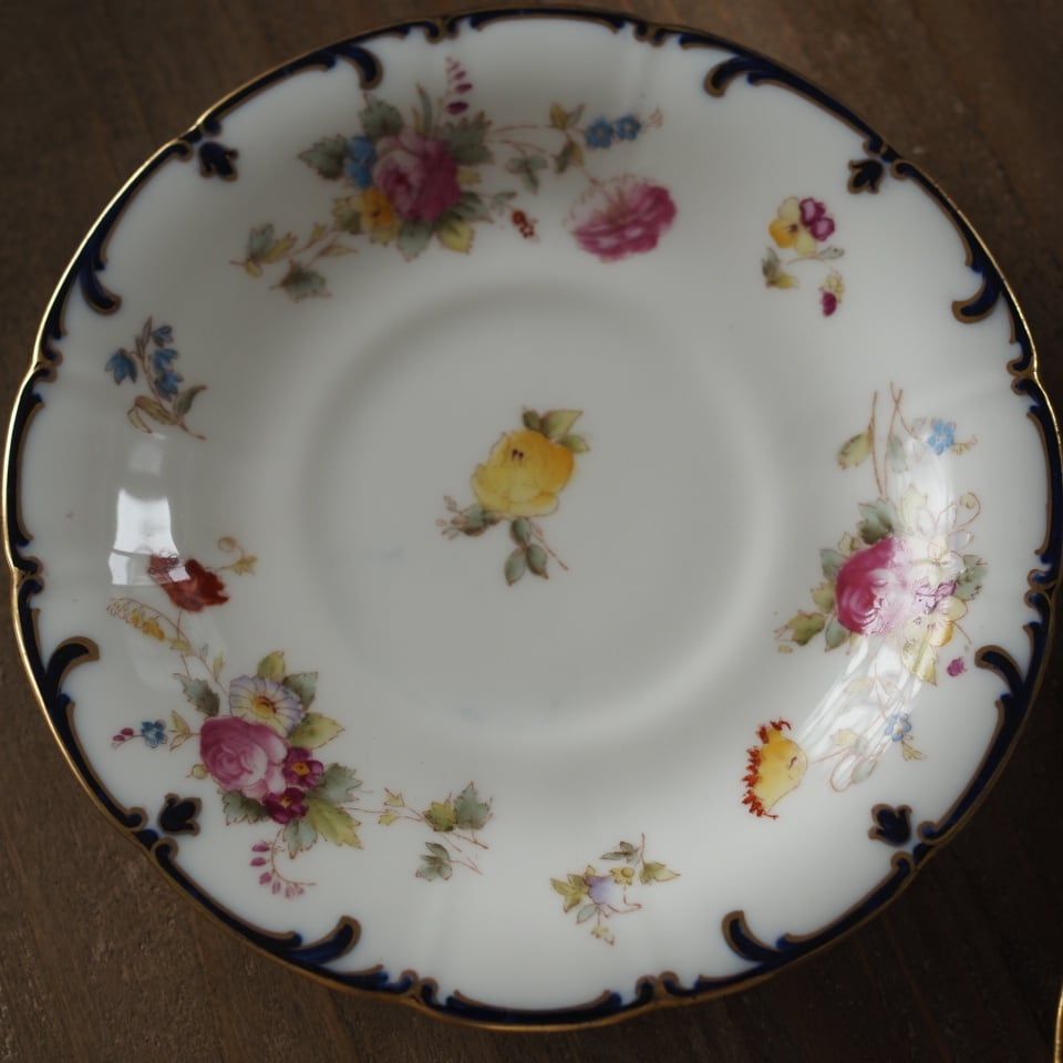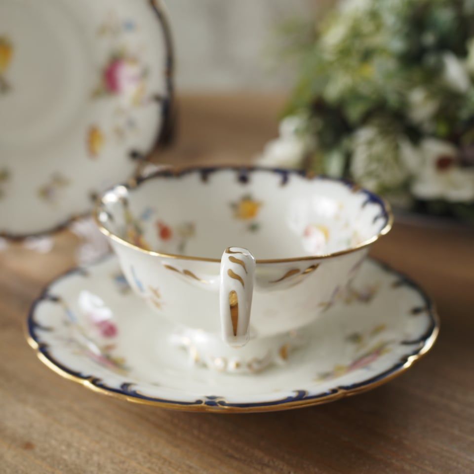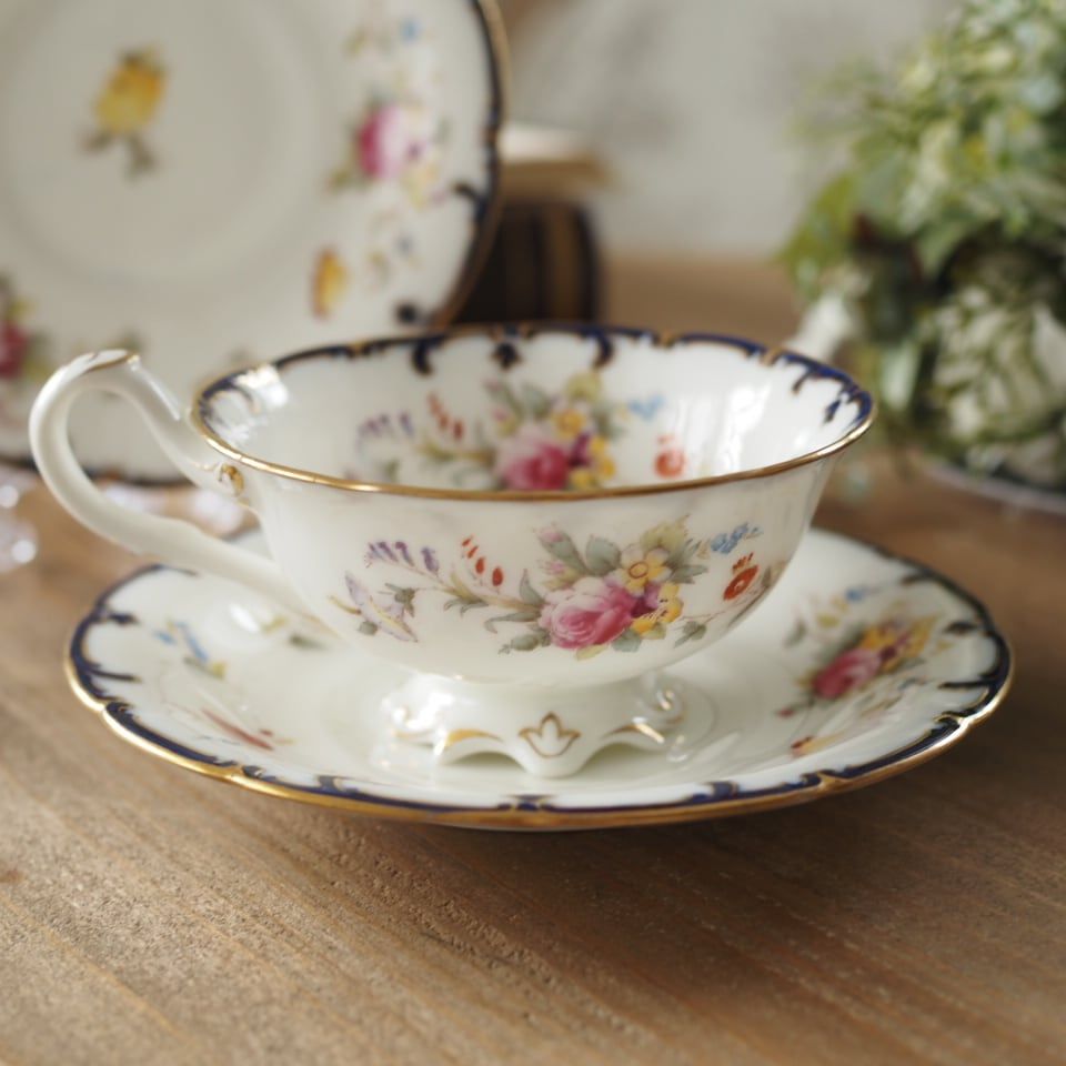 縁に施された濃紺(コバルト)の装飾は、金彩とともに上品なアクセントとなり、クラシックな英国スタイルのティータイムを演出してくれます。