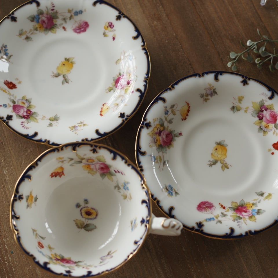英国コウルドン 金彩と薔薇のブーケが咲く優雅なカップ&ソーサー スペアソーサー付 イギリスアンティーク F3