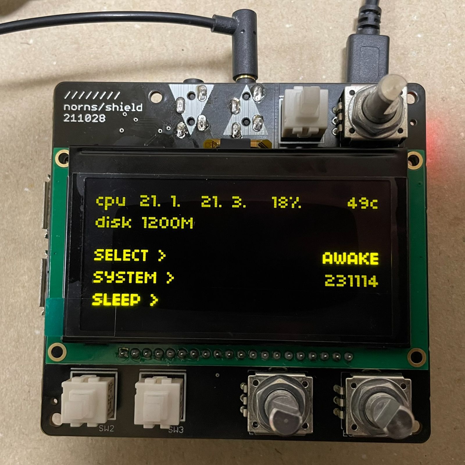 * 電源オフは、必ず NORNSのSYSTEMメニューから「SLEEP」を選択して行ってください。RPIのACTのLEDの点滅が全消灯になるのを確認してから、ACアダプタからの電源の供給を遮断してください。(コンソールログイン中は、RPIの通常のシャットダウン方法で電源断でもかまいません。)正しい手順を踏まないで電源を切ると、SDカードのファイルが破損することがあります。
