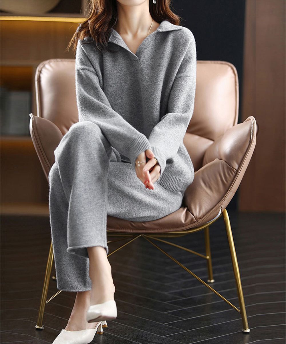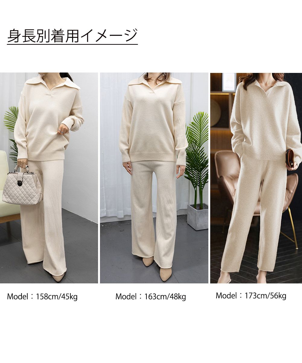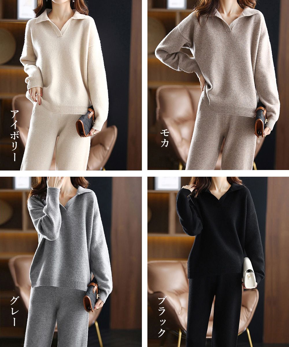 長袖 ポロニットトップス ニットパンツ 上下セット きれいめポロネックニットセーター おしゃれ 20代30代40代50代らくちん Vネック ニットアンサンブル ニットセット 無地