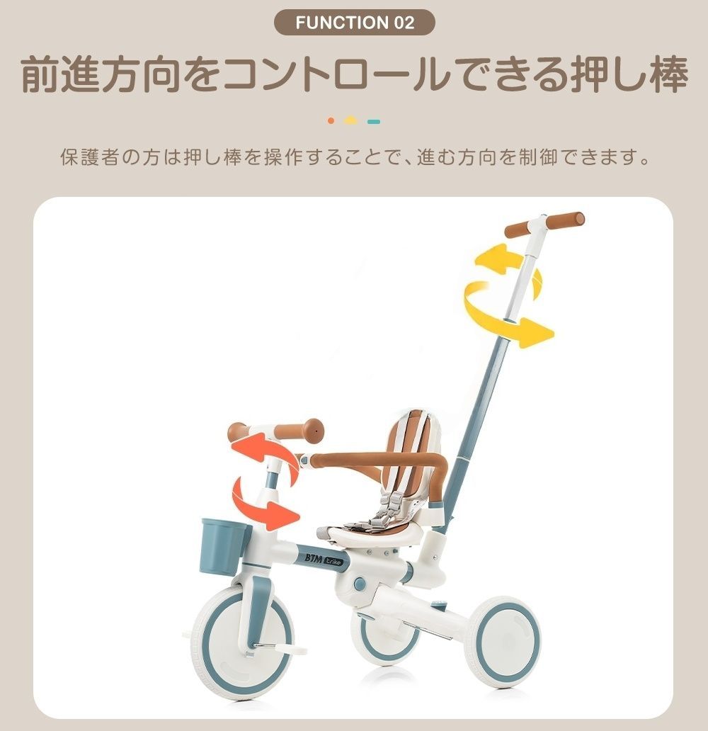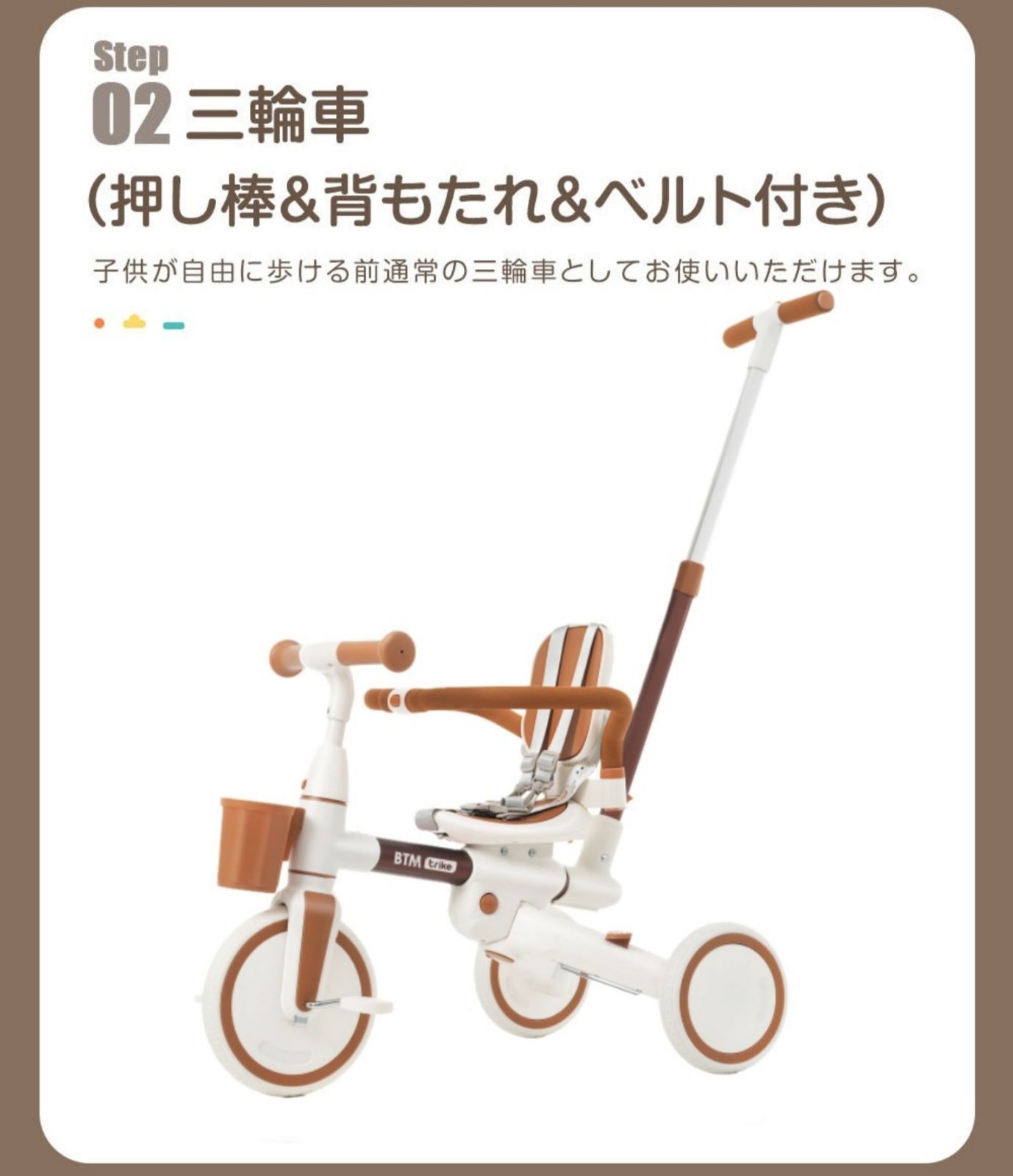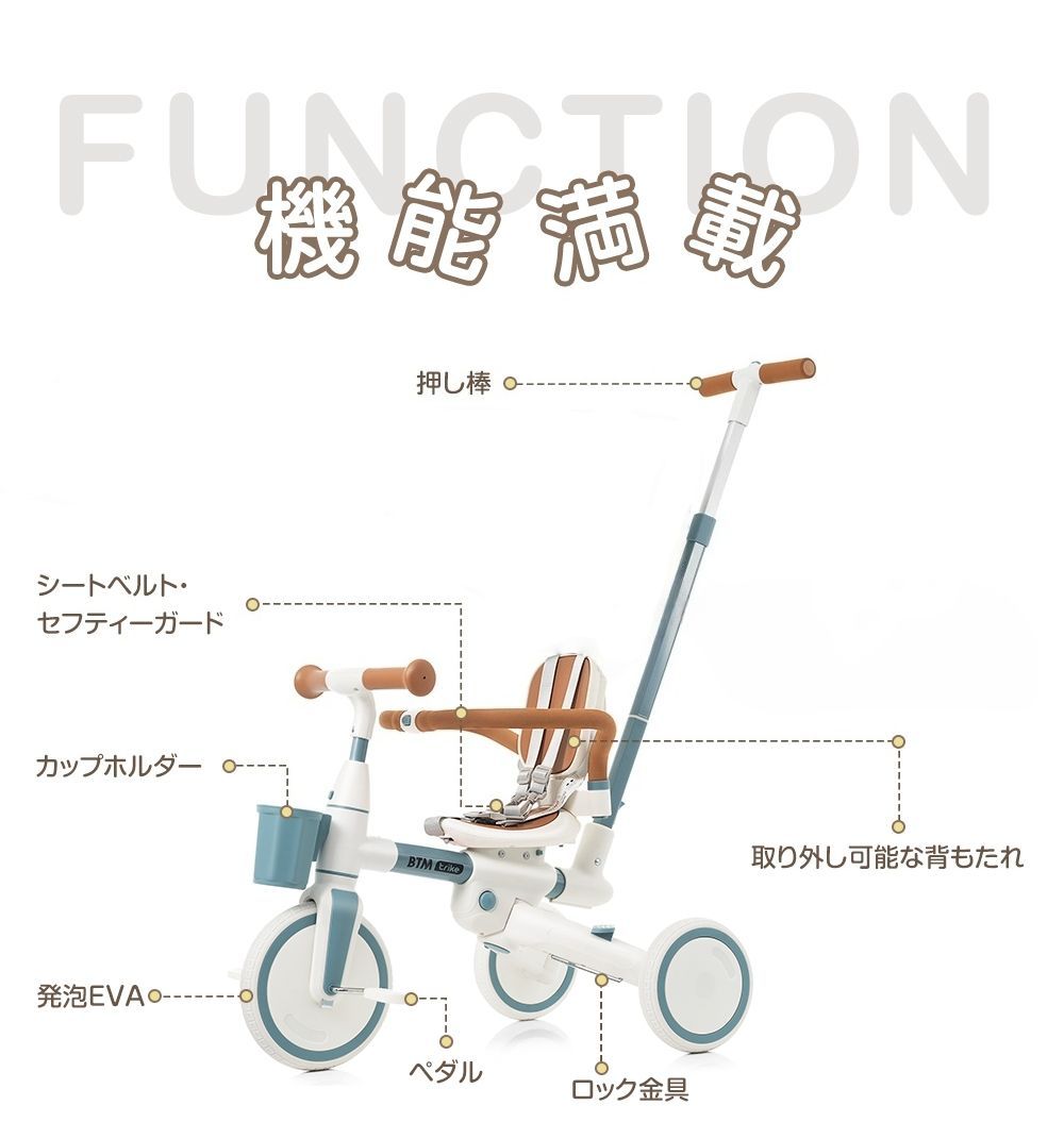 POINT 2.【機能満載】 ①舵取り押し棒:保護者の方は押し棒を操作することで、進む方向を制御できます。 ②ペダルの巻き込み防止:押し棒を使う際はペダルを空回りにしておけば足を挟んでしまうことを防げます。 ③取り外し可能な背もたれ:背もたれのボタンを押し、背もたれとセフティーガードのサポートバーを取り外せます。 ④4段階調節可能なかじとり押し棒:心地よい素材を採用し、操作をもっとやすくなります。 ⑤シートベルト・セフティーガード:走行時の揺れによりずり落ちるなどの事故からお子様を守ります。⑥成長に合わせて調整できるベルト:お子さまが成長に合わせて高さを3段階調節できます。