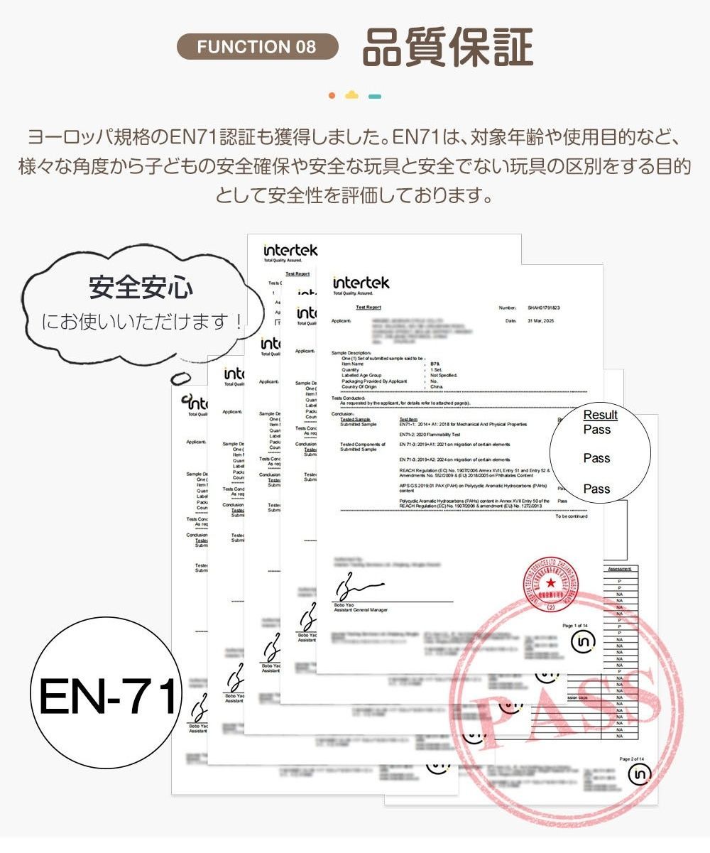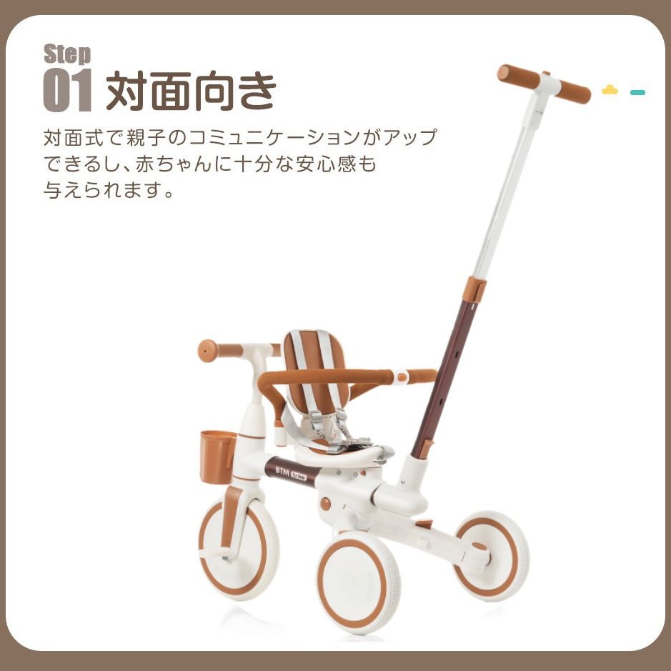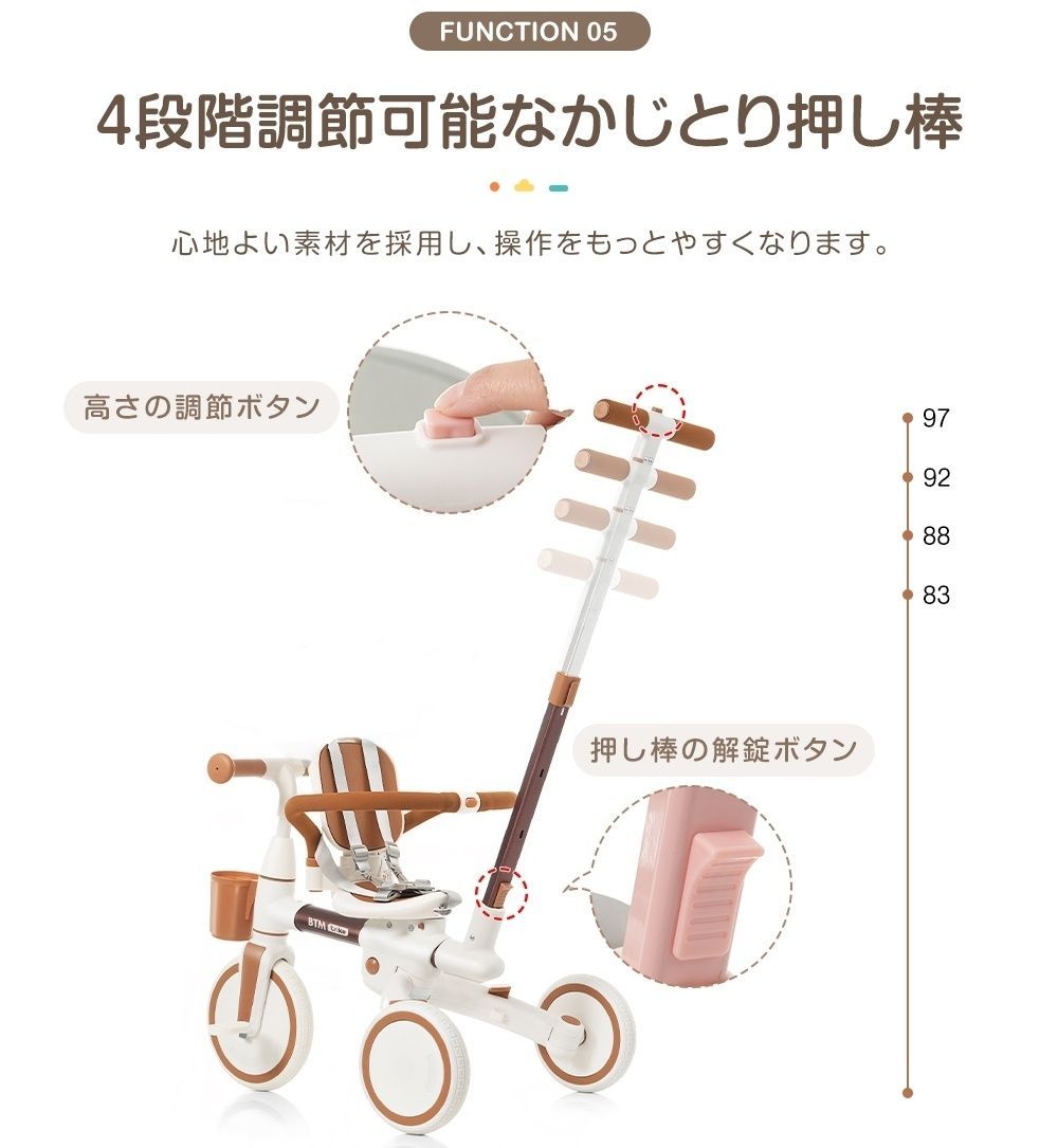 POINT 2.【機能満載】 ①舵取り押し棒:保護者の方は押し棒を操作することで、進む方向を制御できます。 ②ペダルの巻き込み防止:押し棒を使う際はペダルを空回りにしておけば足を挟んでしまうことを防げます。 ③取り外し可能な背もたれ:背もたれのボタンを押し、背もたれとセフティーガードのサポートバーを取り外せます。 ④4段階調節可能なかじとり押し棒:心地よい素材を採用し、操作をもっとやすくなります。 ⑤シートベルト・セフティーガード:走行時の揺れによりずり落ちるなどの事故からお子様を守ります。⑥成長に合わせて調整できるベルト:お子さまが成長に合わせて高さを3段階調節できます。