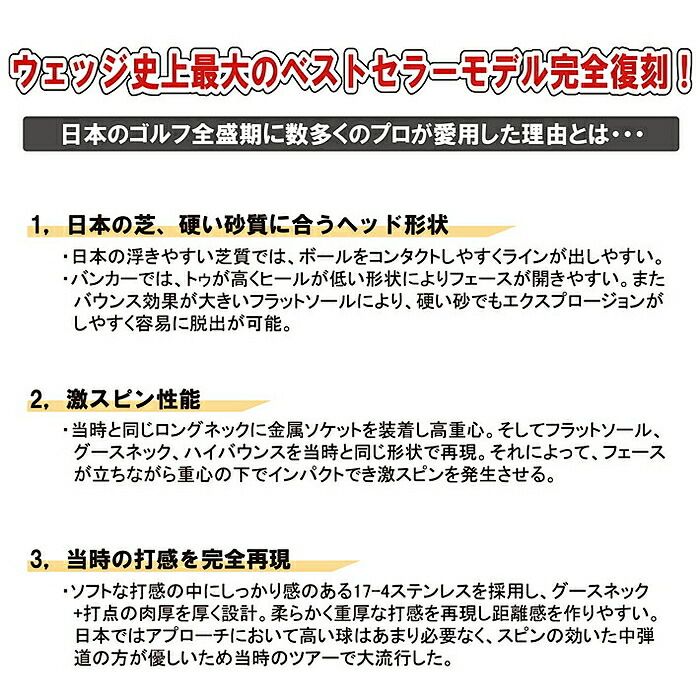 70年代後半から90年代前半にかけて一世風靡したサンドウェッジの代名詞的存在のマスターモデルを素材から形状まで再現し、新溝ルールに適合させた「MASTER MODEL完全復刻」。