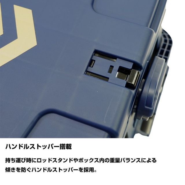 持ち運び時にロッドスタンドやボックス内の重量バランスによる傾きを防ぐハンドルストッパーを採用。