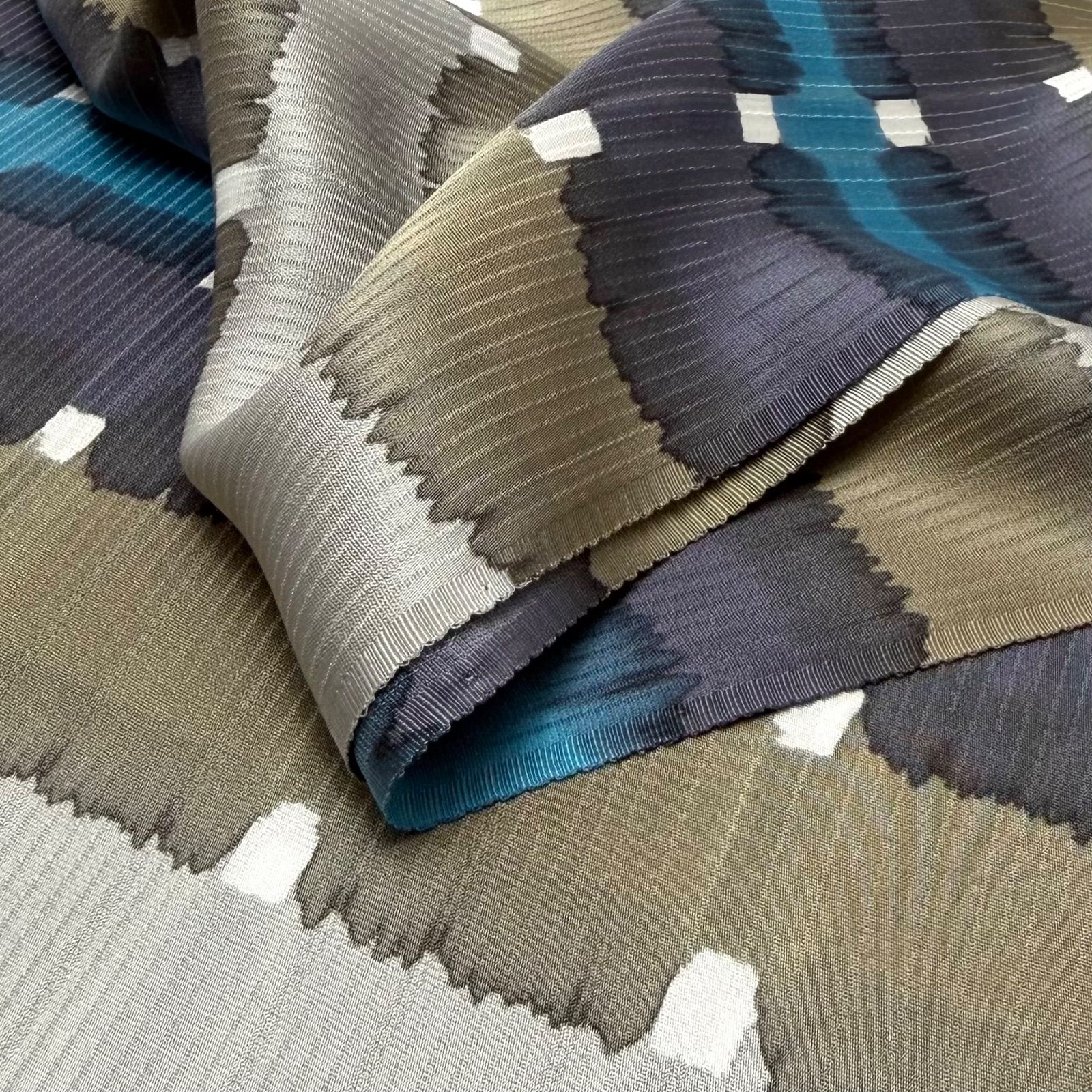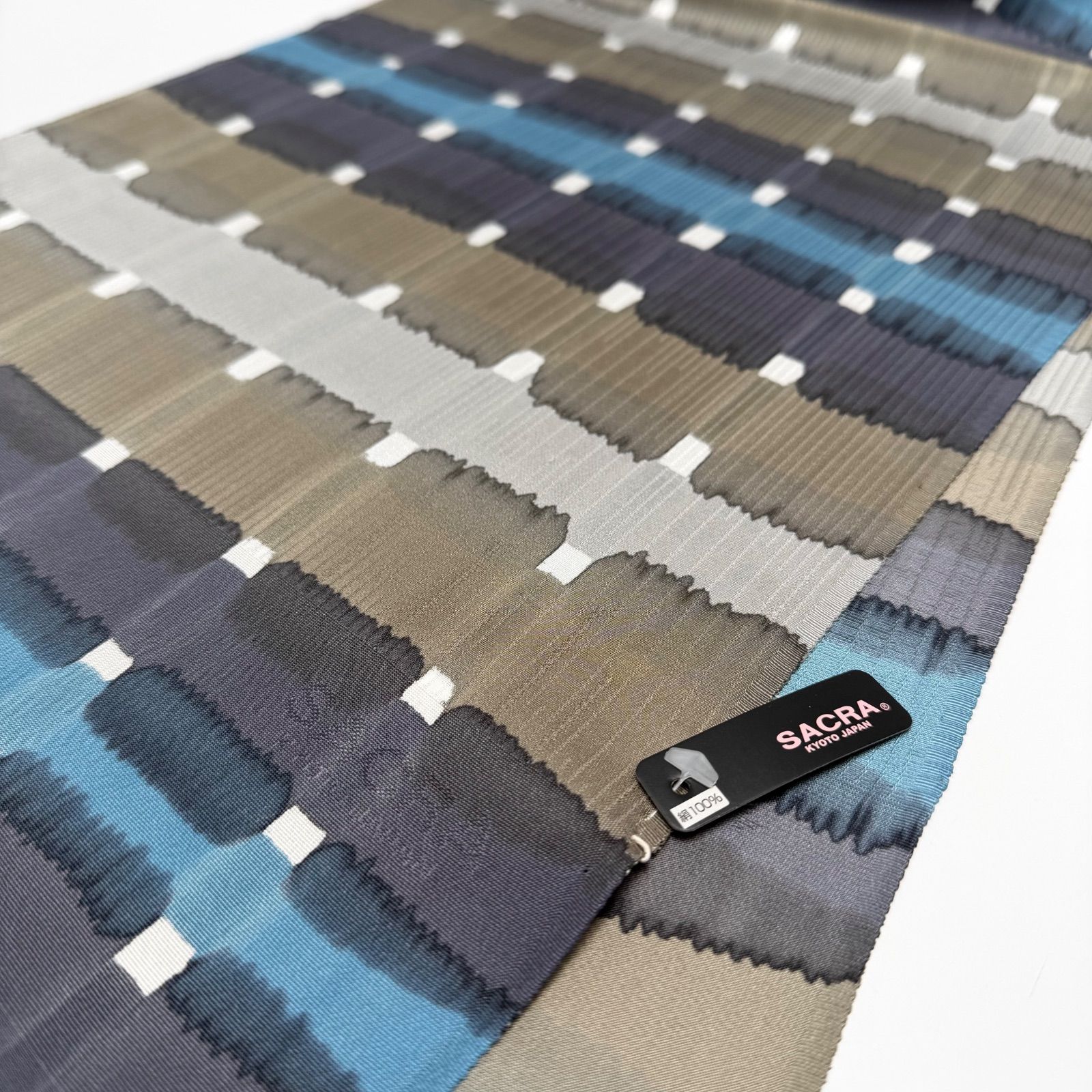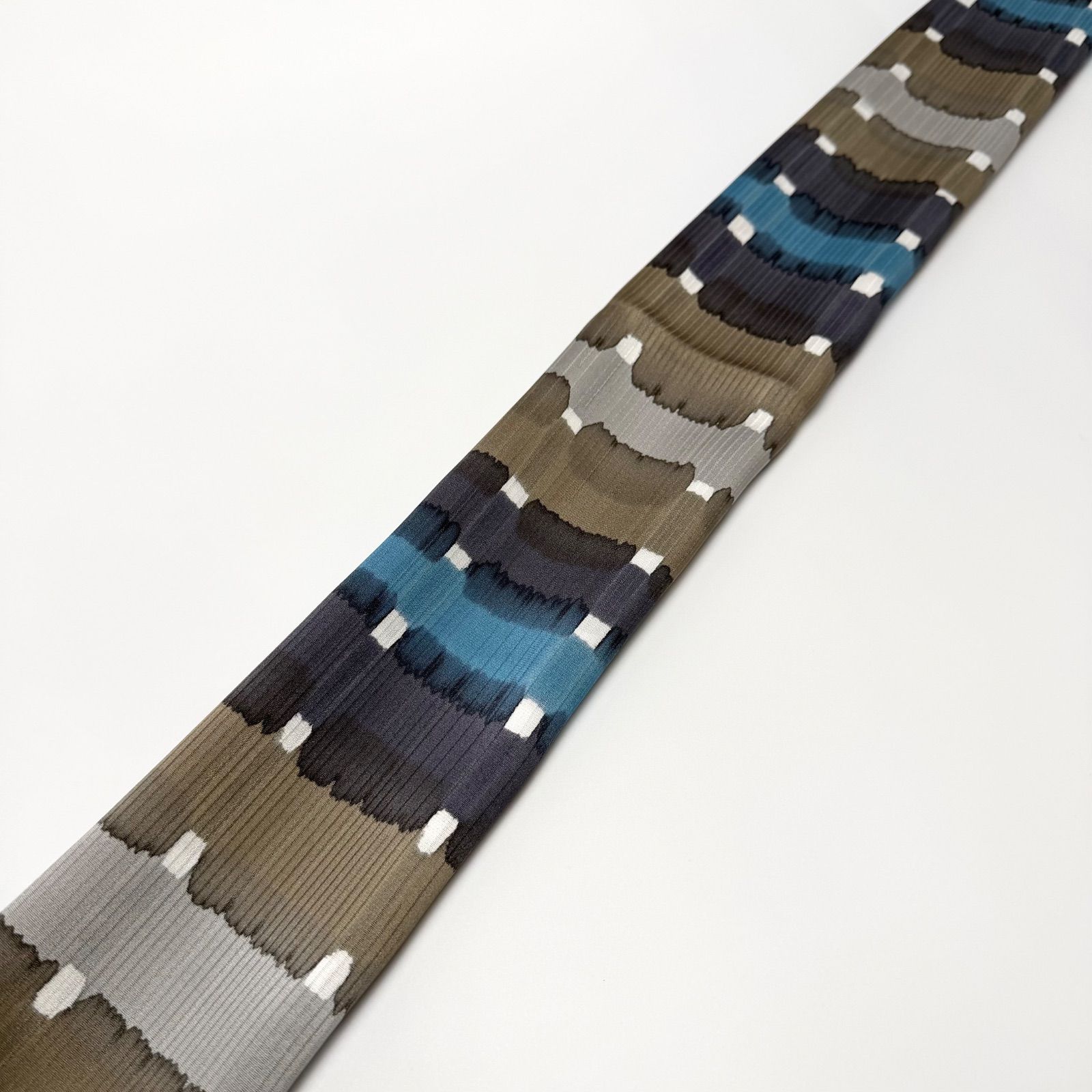 こちらの帯揚げは、横四色のストライプに沿って色が滲むようなデザインが施されており、モダンで抽象的な印象を与えてくれています。