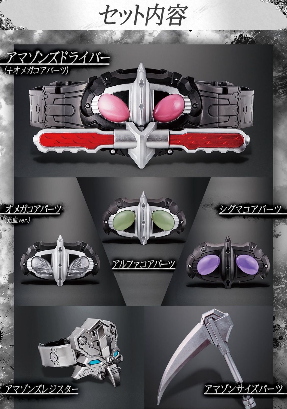 本セットには、「アマゾンズドライバー本体」と「仮面ライダーアマゾンオメガ」「仮面ライダーアマゾンアルファ」「仮面ライダーアマゾンシグマ」の3人に変身可能な各コアパーツに加え、主人公の水澤悠(みずさわ はるか/演:藤田富)が「仮面ライダーアマゾンオメガ」に変身する際に演出される特徴的な充血発光を再現した「アマゾンオメガ用コアパーツ(充血ver.)」、手鎌状の武器である「アマゾンサイズパーツ」、アマゾン達の人喰いの欲求を制御する腕輪型装置「アマゾンズレジスター」が付属します。