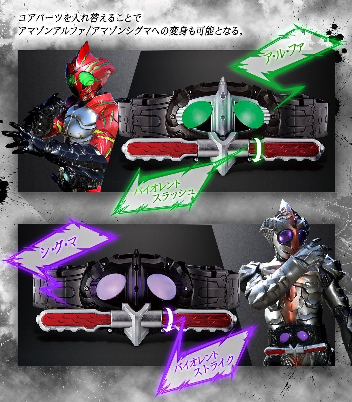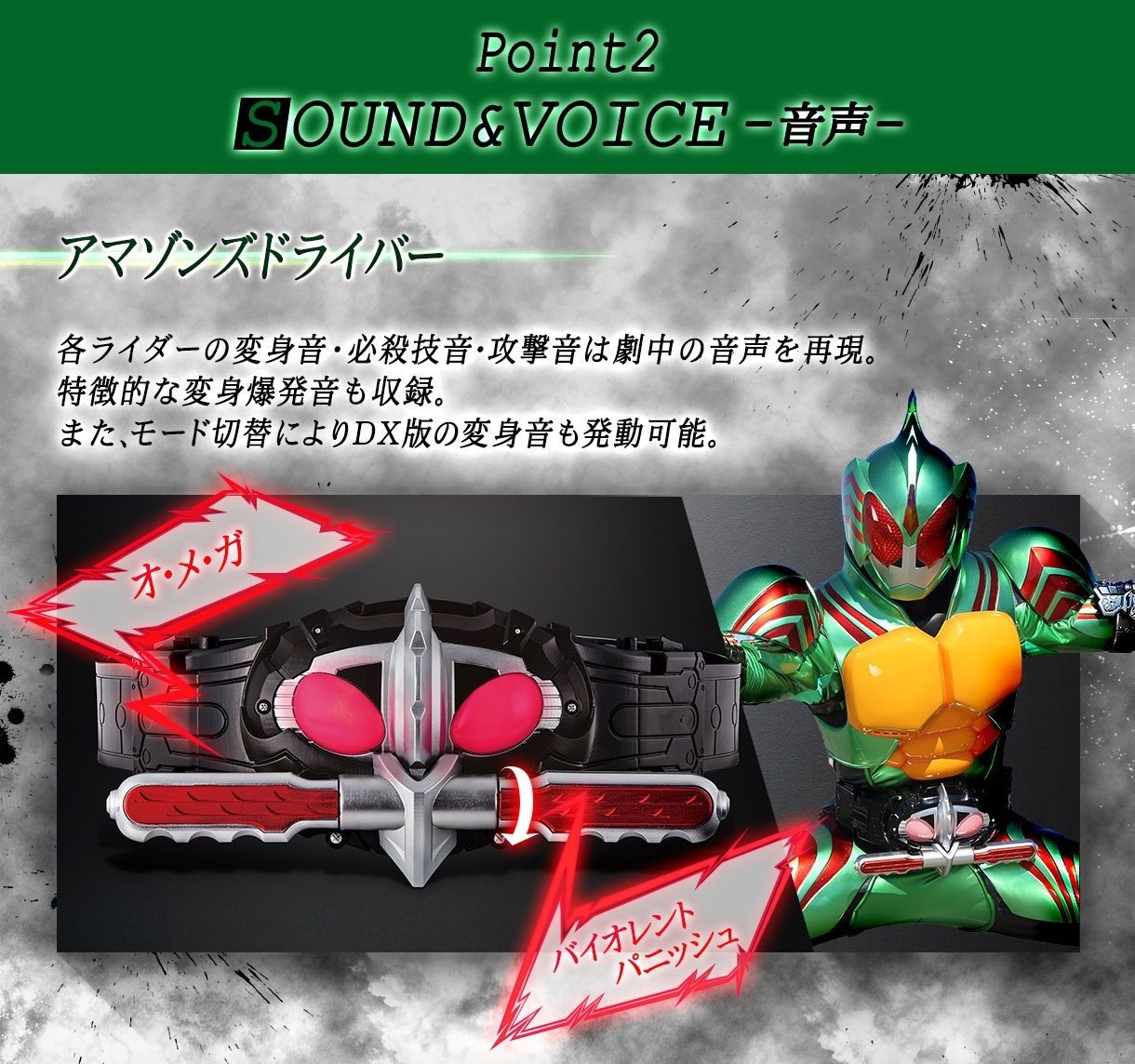 付属のアマゾンズレジスターは、音声・発光ギミックを搭載しており、劇中同様、目のLEDが青から赤に替わり、アマゾンへの変身音やアマゾンオメガ素体への変身音が鳴ります。