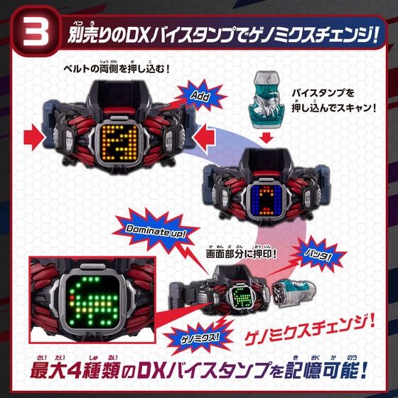 また、別売りのDXバイスタンプシリーズを画面部分に押印することで劇中のゲノミクスチェンジを再現することができます。ベルト本体の両側を2回押し込むと、必殺技待機音が発動。さらに両側を押し込むことでゲノミクスチェンジの際に記憶した最大4種類のDXバイスタンプシリーズ固有の必殺技音が発動します。