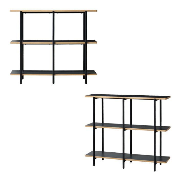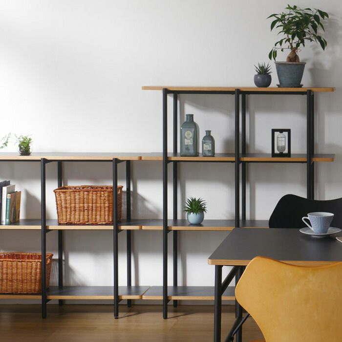 傷や汚れに強いメラミン化粧板を使用したブラックカラーの棚板に、エッジ部分へオーク材をあしらったシックなオープンラックです。