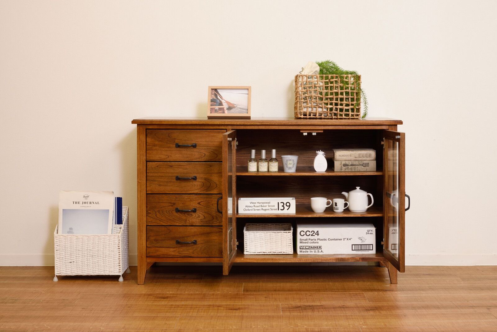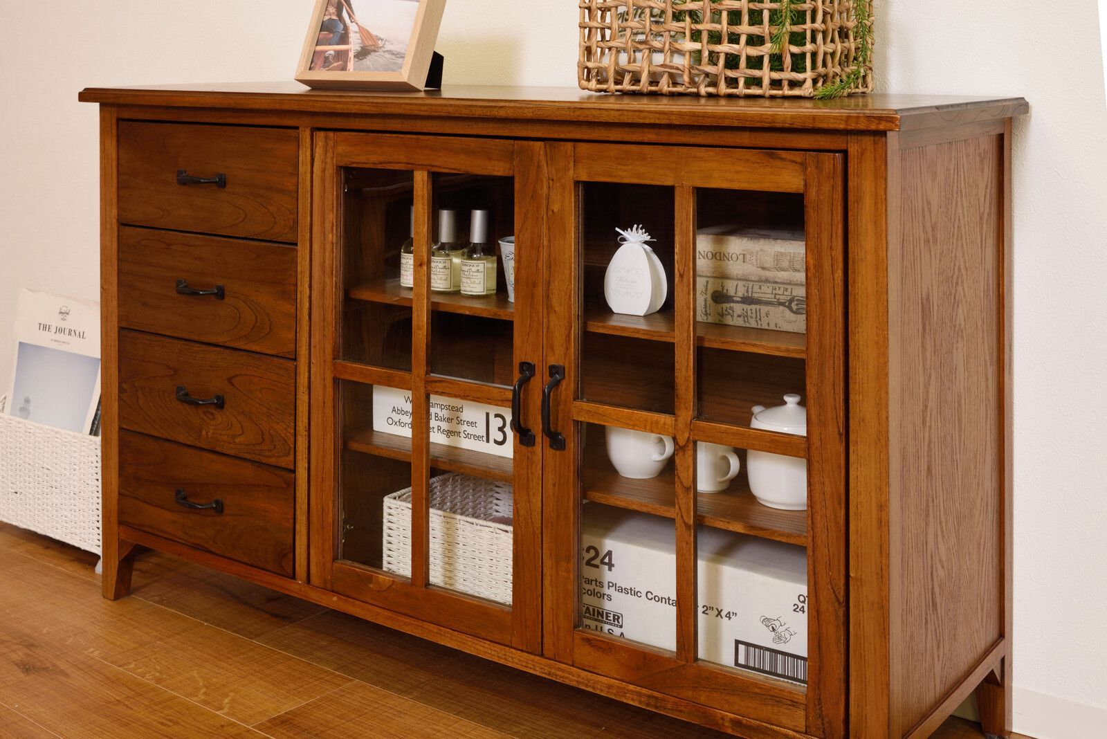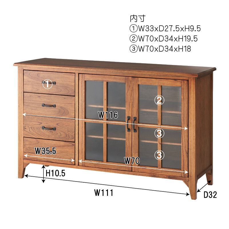 キャビネット 食器棚 カップボード チェスト 4段 木製チェスト 木製 キッチン収納 ガラス扉 インテリア 家具 本州