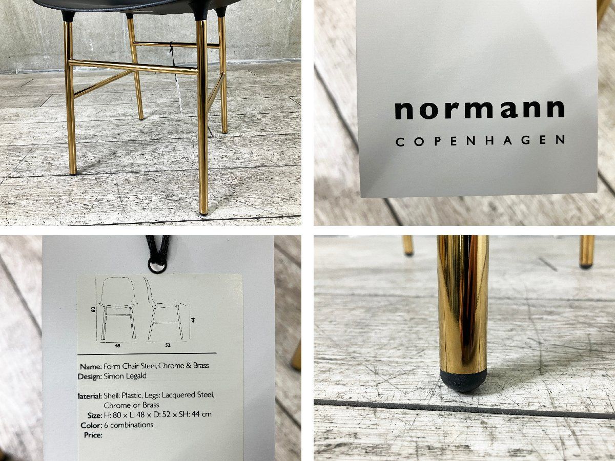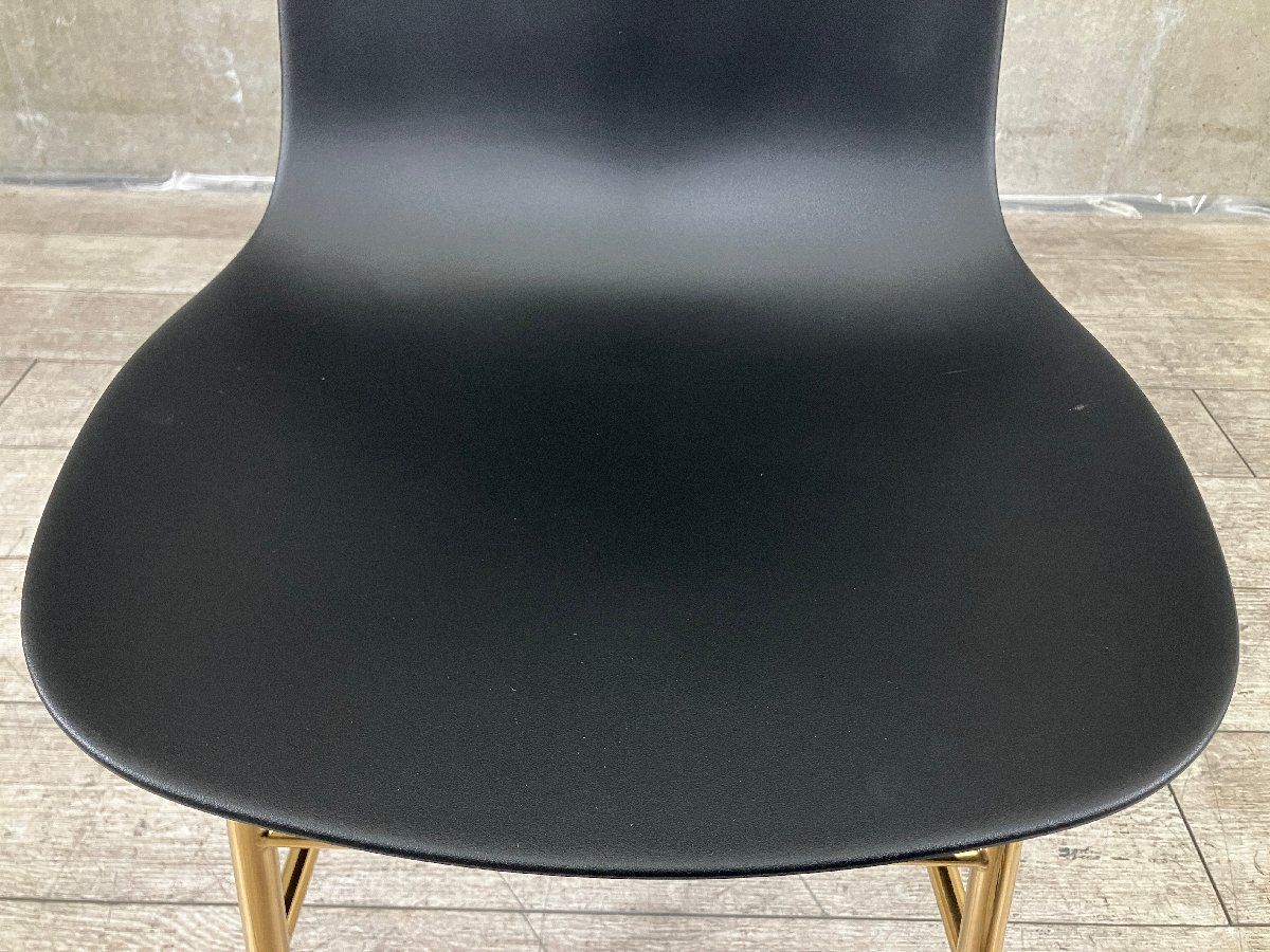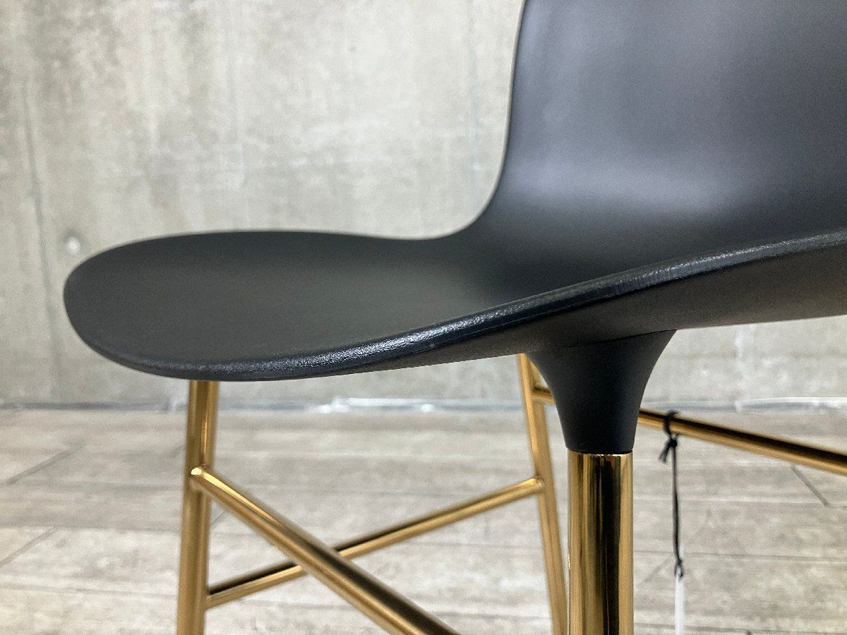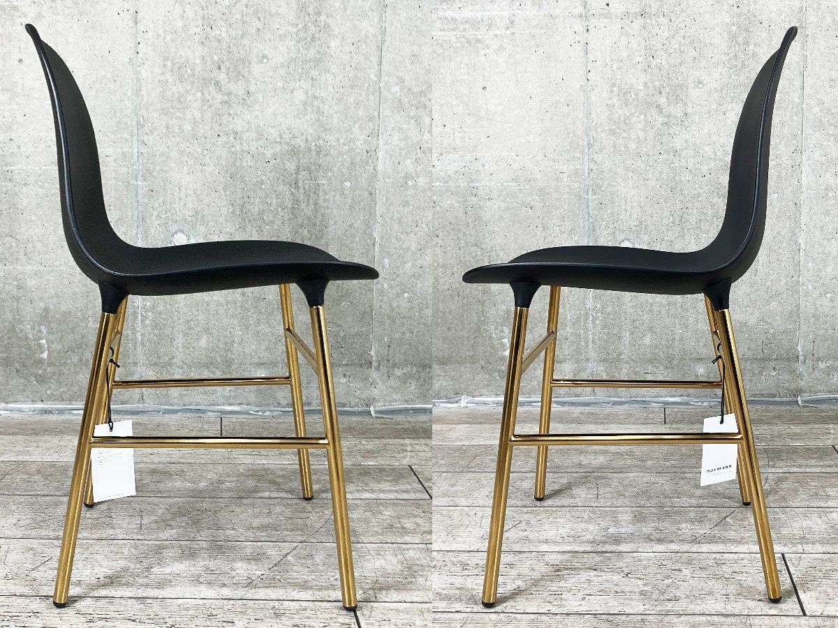 ■デンマークのデザインブランド Normann Copenhagen(ノーマン コペンハーゲン) による「FORM(フォーム)」チェア。 デザインは Simon Legald(サイモン・レガルド) が手がけています。 一体成型のプラスチックシェルと、金属脚を滑らかに一体化したシームレスなデザインが特徴。 ミニマルでありながらも、細部にまで精度の高さを感じさせる仕上がりです。 こちらはマットなブラックシェルに、上品な輝きを放つゴールドフレームを組み合わせた仕様。 落ち着きの中に華やかさを添える配色で、ダイニングからラウンジシーンまで幅広く活躍します。 シンプルなフォルムながら、空間のアクセントとしても存在感を発揮する一脚です。新品定価:¥72,600(税込み)