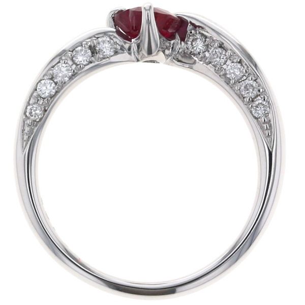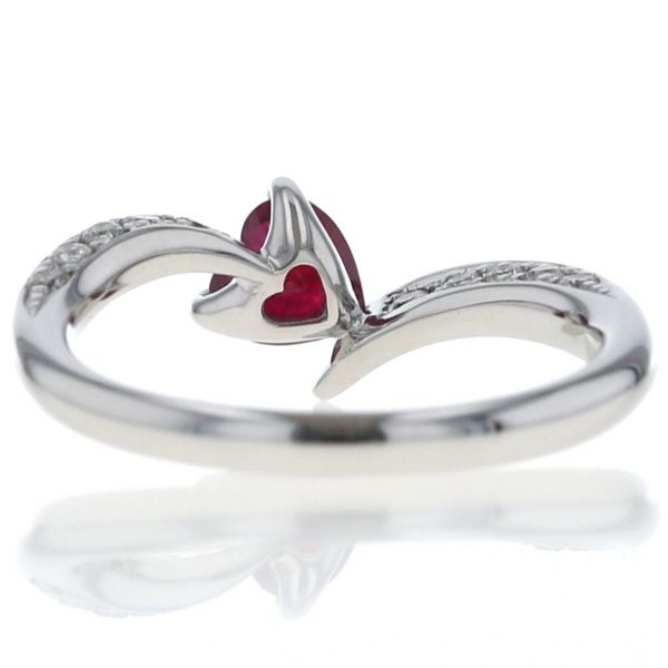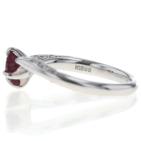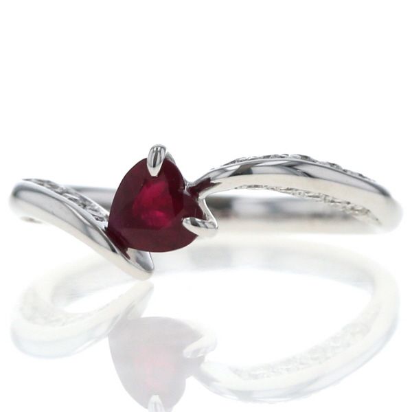 【商品紹介】斜めに配されたハートモチーフと流れるようなウェーブラインを組み合わせたリングです。中央にルビーが鮮やかな発色を放ち、側面にダイヤモンドが並び、艶やかなK18WGにコントラストを添えています。ハートとウェーブのアームの流れが一体となり、軽やかで動きのある印象です。