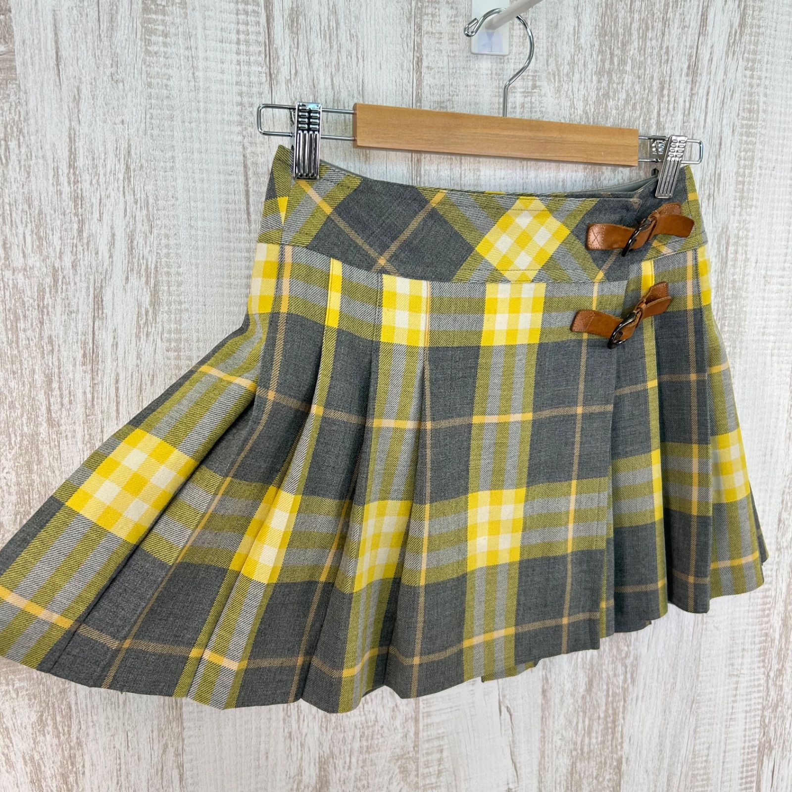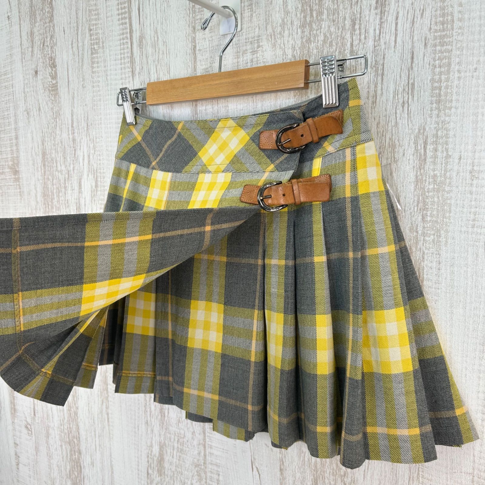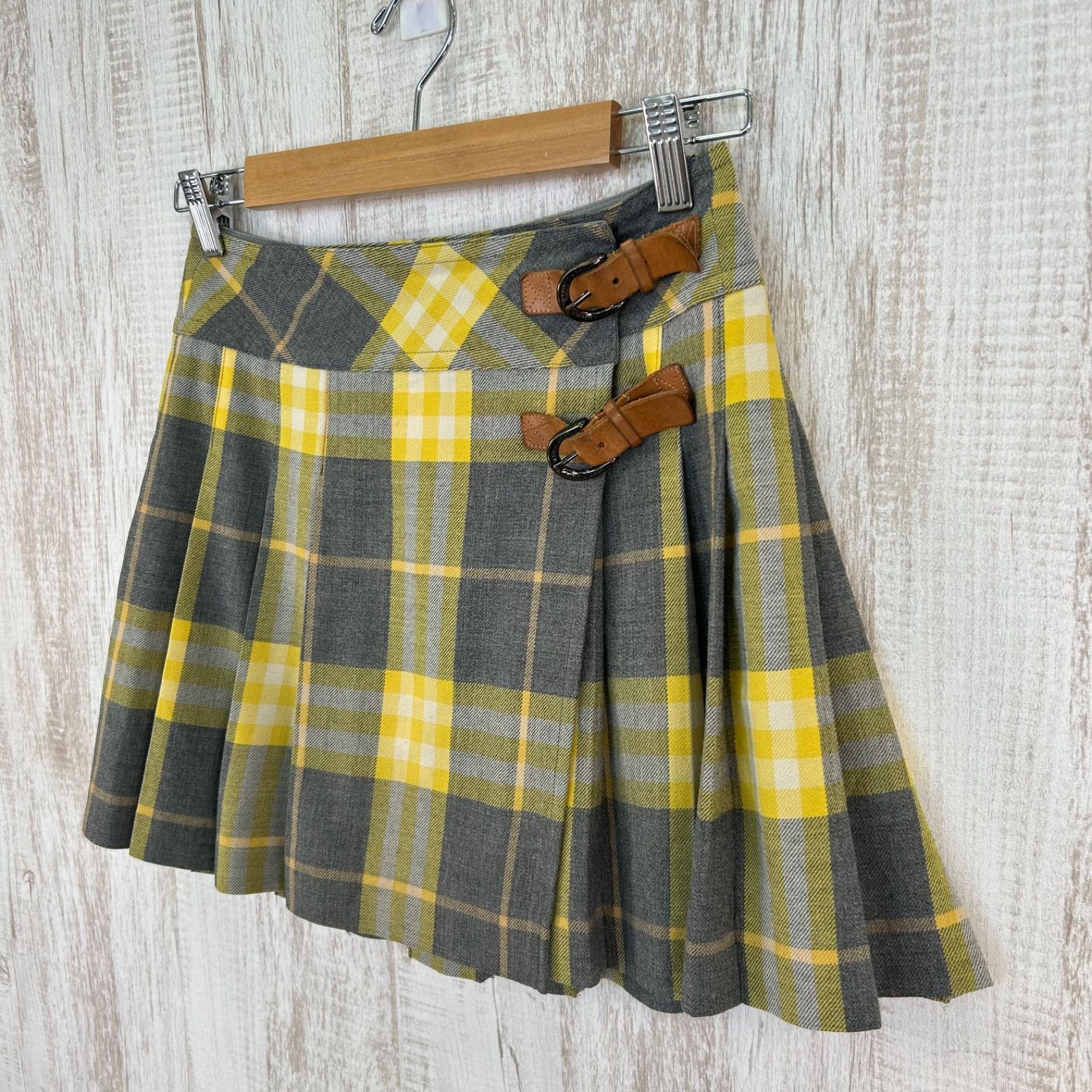 BURBERRY BLUE LABEL バーバリーブルーレーベル チェック 総柄 ベルト付き ウール プリーツ ミニスカート イエロー