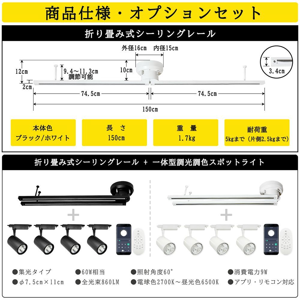 2年保証 ダクトレール 折り畳み式 1.5M ライティングバー 簡易取付式 シンプル おしゃれ 角度360°自由調整 調光調色スポットライト同時に