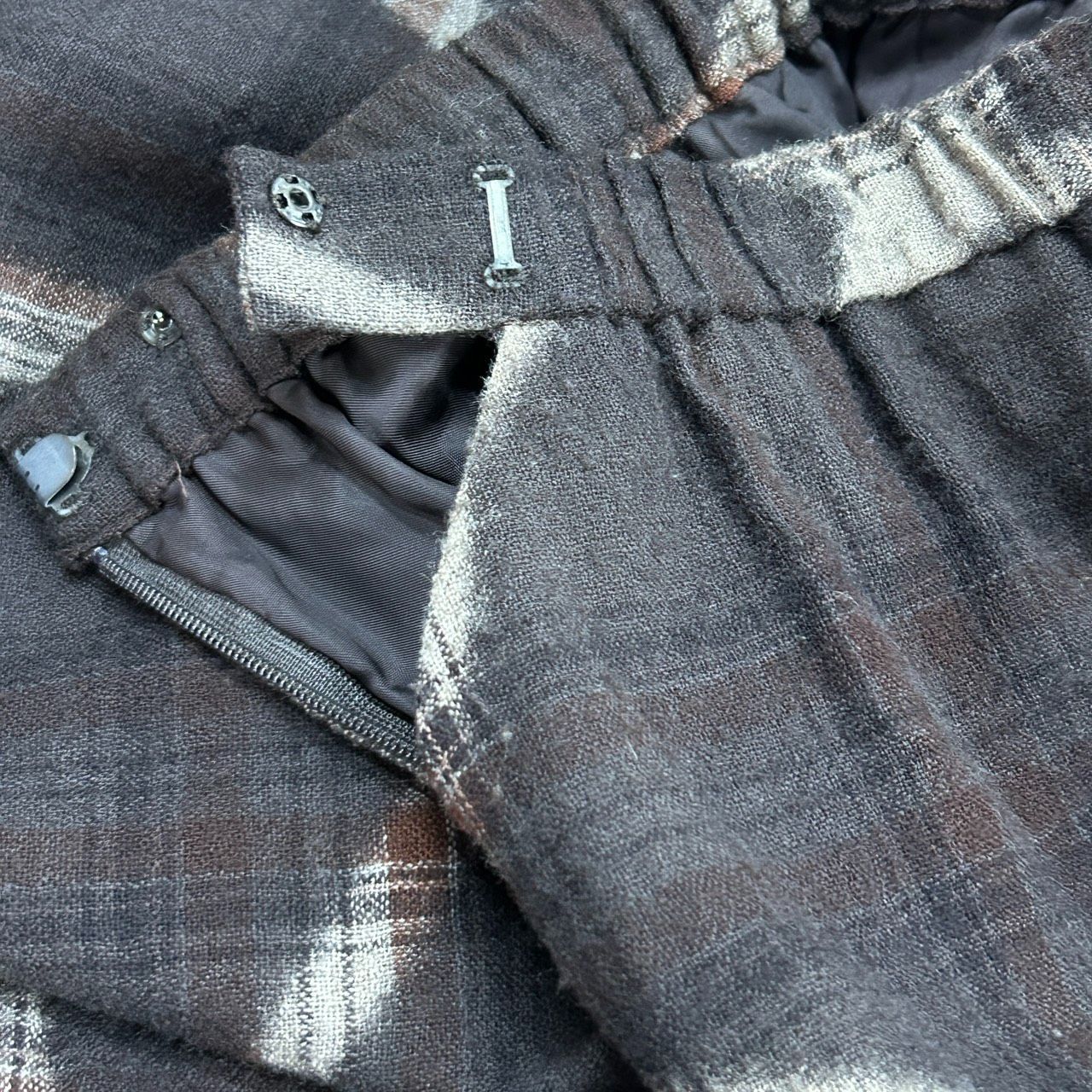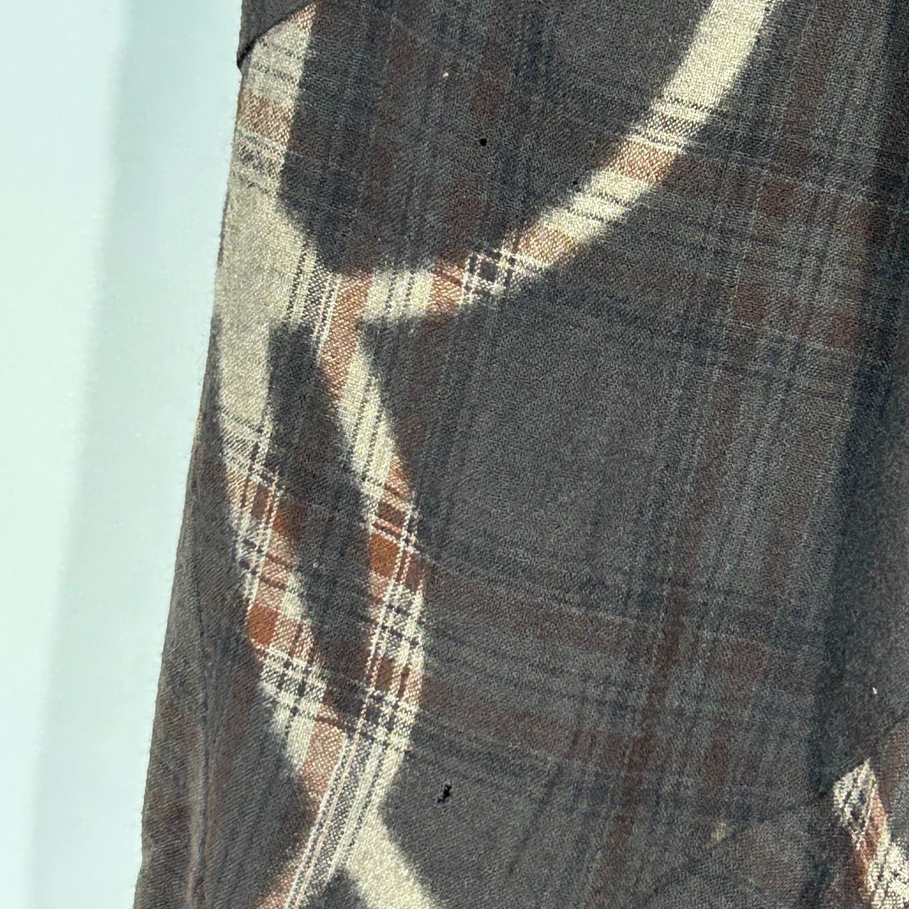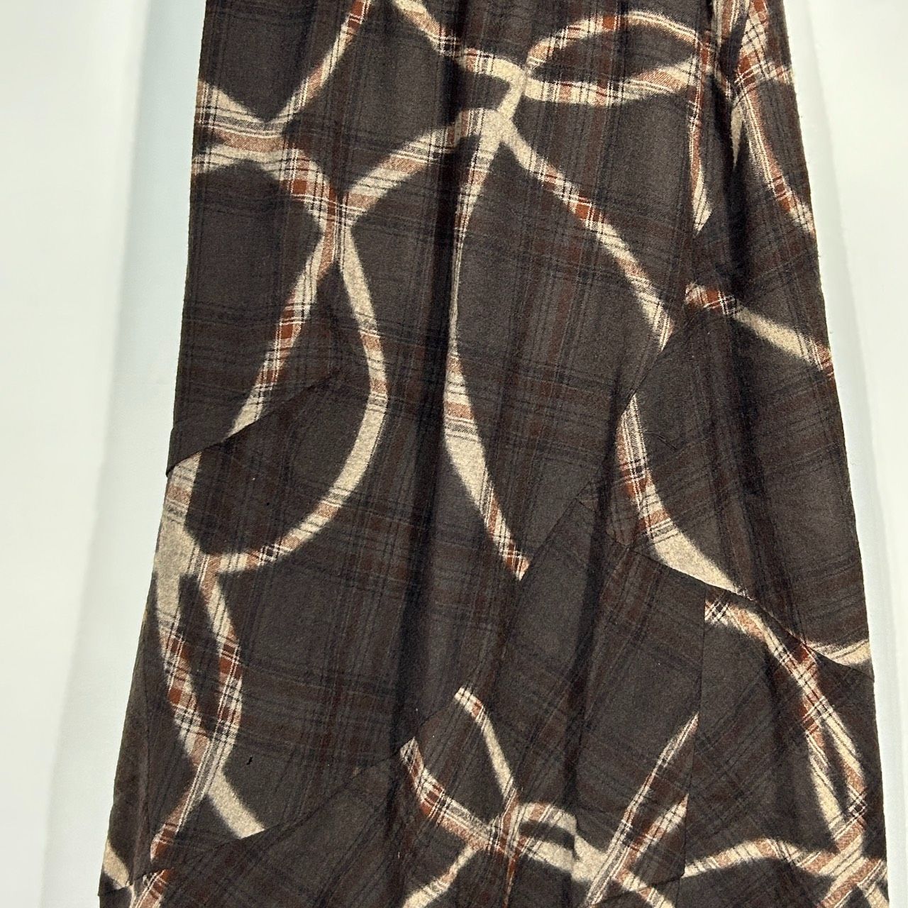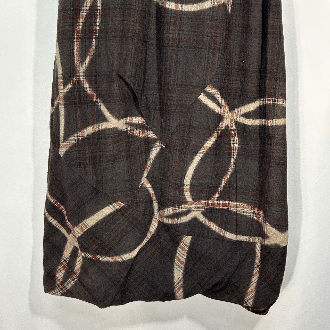 ブラウン系の落ち着いた色味をベースに、白やオレンジがかった色で曲線的なラインとチェック柄が織り込まれた独特のテキスタイルが特徴です。着用時にふんわりとしたシルエットを形成する独創的なデザインです。