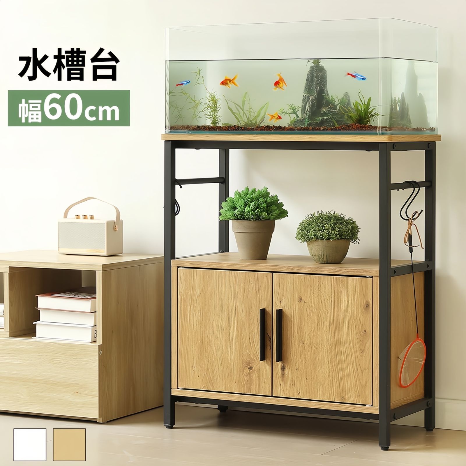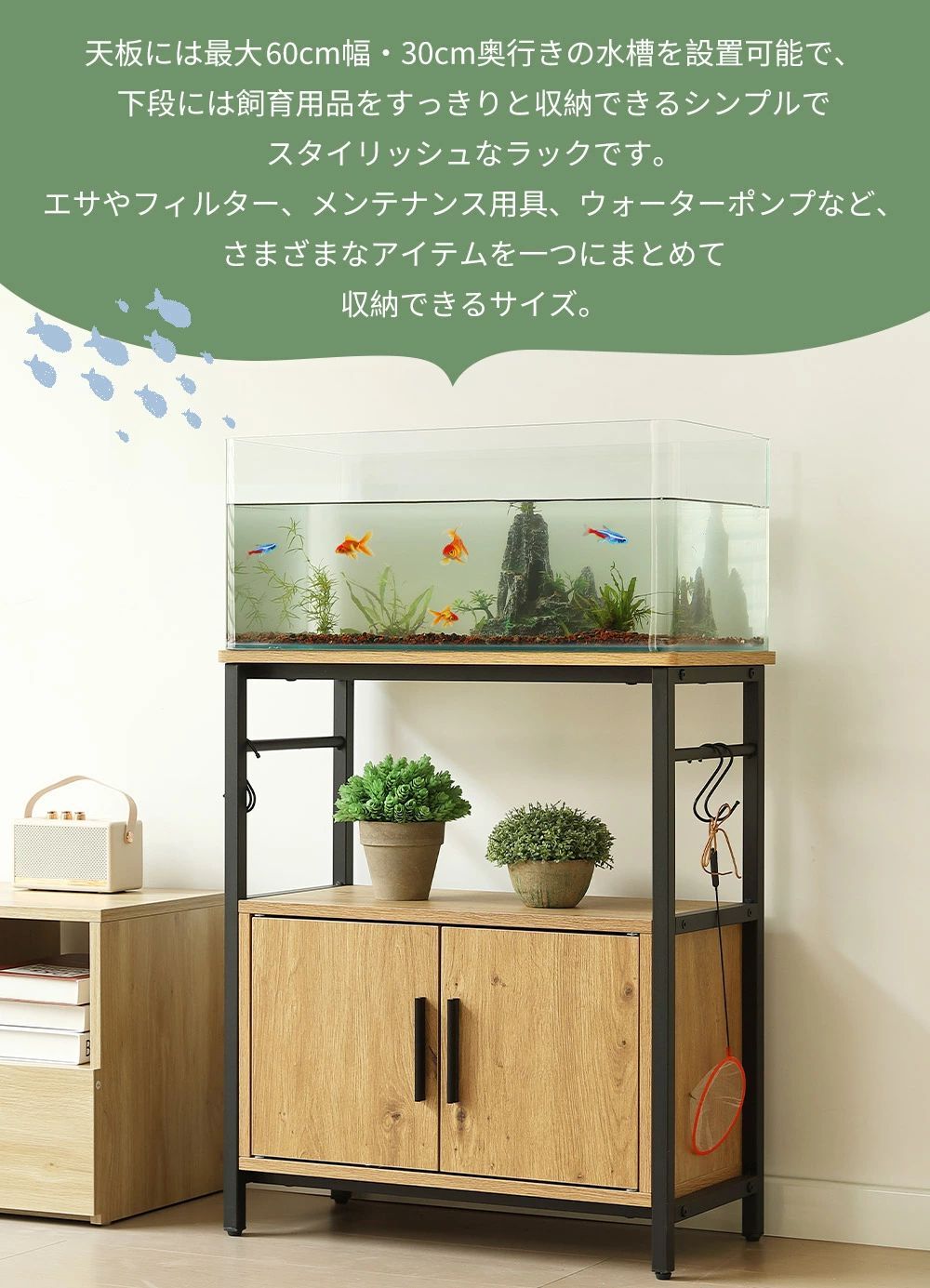 天板には最大60cm幅・30cm奥行きの水槽を設置可能で、下段には飼育用品をすっきりと収納できるシンプルでスタイリッシュなラックです。エサやフィルター、メンテナンス用具、ウォーターポンプなど、さまざまなアイテムを一つにまとめて収納できるサイズ。水槽周りのごちゃつきを解消し、スッキリとした快適な空間を提供します。ドアが付いており、生活感を隠して清潔感を保てます