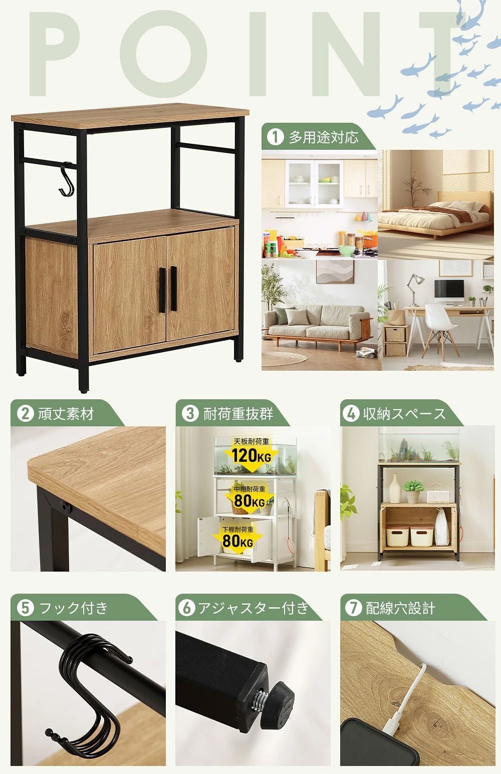 01.【多用途対応】水槽台としてはもちろん、キッチン収納ラック、ベッドサイドテーブル、リビングのサイドキャビネットなど、さまざまな用途に使える万能設計。どんなインテリアにもスッと馴染みます。キッチンラックとして:電子レンジや調味料置きに ベッドサイドテーブルとして:目覚まし時計や本、照明の設置に;リビング収納として:観葉植物や小物ディスプレイに;書類キャビネットとしても活躍