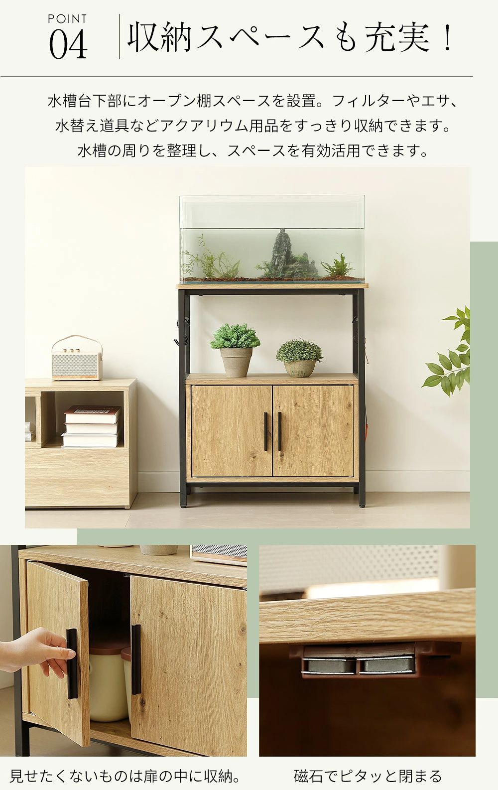 03.【収納スペースも充実!】水槽台下部にオープン棚スペースを設置。フィルターやエサ、水替え道具などアクアリウム用品をすっきり収納できます。水槽の周りを整理し、スペースを有効活用できます。見せたくないものは扉の中に収納。 磁石でピタッと閉まる