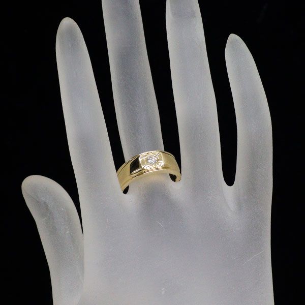 一粒の上質ダイヤモンドがきらりと光る、豪華なイエローゴールリングです。シンプルなデザインですが、艶やかな鏡面光沢とほどよい重厚感で高級感ある仕上がり。リッチ感がありながらも、カジュアルスタイルからオフィスシーンまで幅広くお使いいただける一品に仕上げられています。