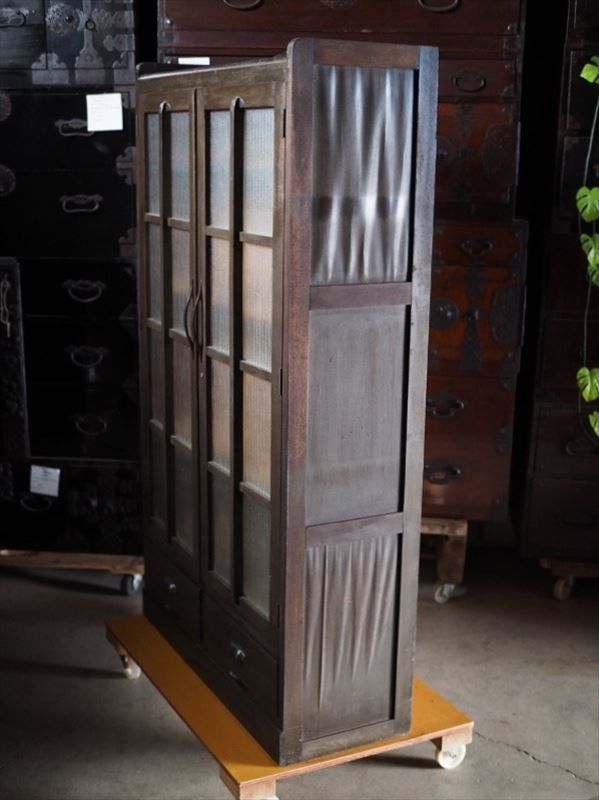 This retro Showa-era molded glass cabinet is being sold at an outlet due to the wavy plywood on the sides. It's solidly constructed and practical for use as a bookshelf or cupboard. As this is an older piece, there may be some wear, so please check the images and videos. (◎ [Note] ① Items over K size cannot be delivered via "household goods delivery" on Tuesdays. ② Items over 220 and H size cannot be delivered to some remote islands.) If you have any questions, please contact us by phone, LINE, email, or Instagram message. We will answer honestly.(幅)880mm×(奥)350mm×(高)1490mm