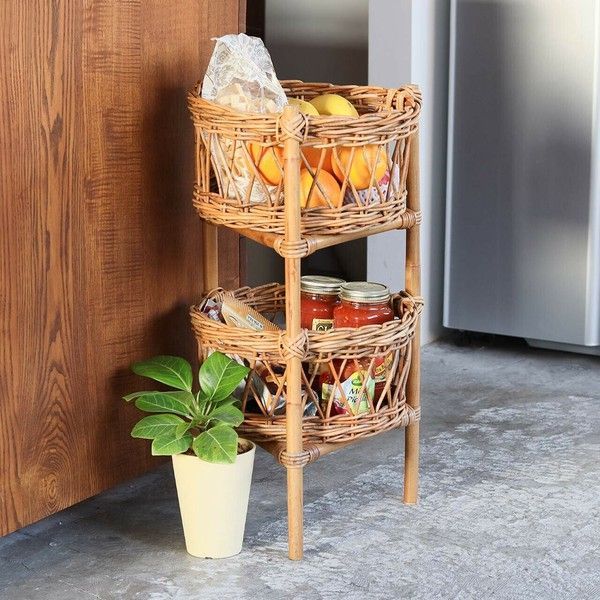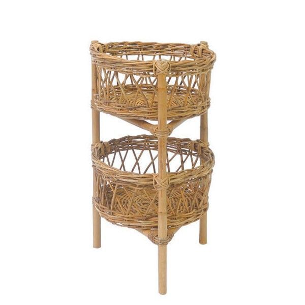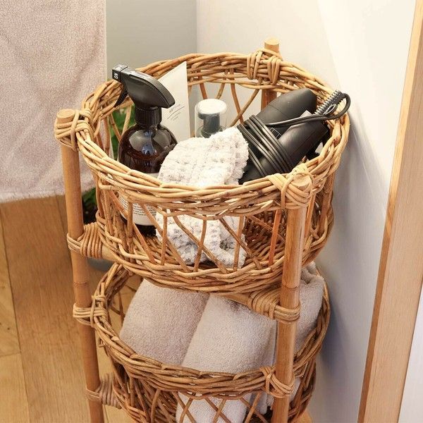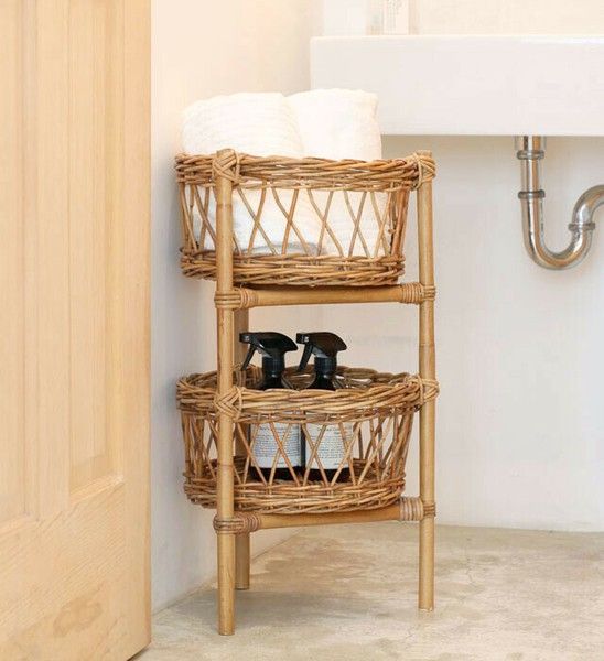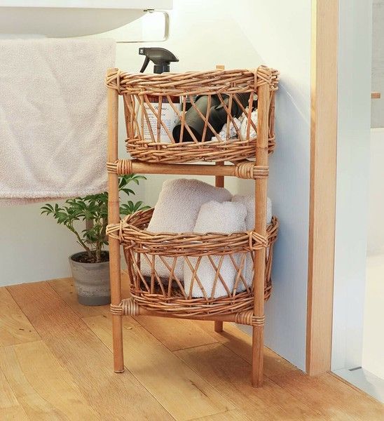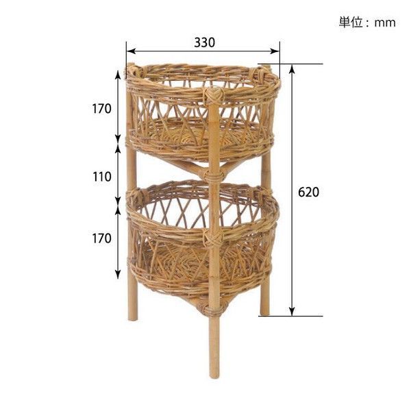 ーーーー風合い豊かな皮つきラタンの2段バスケット ーーーー