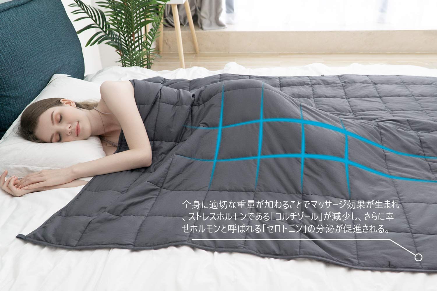 ?【母親の抱擁力の再現】ハグには人をストレスから解放する効果があるといわれます。更に人体体重の10%の重力が母親の抱擁力に近いと言われており、重力ブランケットはこの力を再現し、安心感と癒し感で深い眠りに導きます。