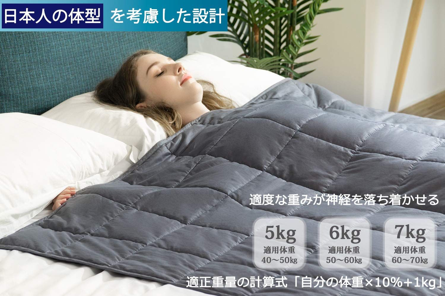 ?【重さ選びについて】重力ブランケットを選んだとき、自分の体重の10%+1kgの重さがおすすめです。5kg(体重範囲 40kg~50kg)、6kg【体重範囲 50kg~60kg】、7kg【体重範囲 60kg~70kg】。ブランケットサイズ:150×210cm(シングル布団)