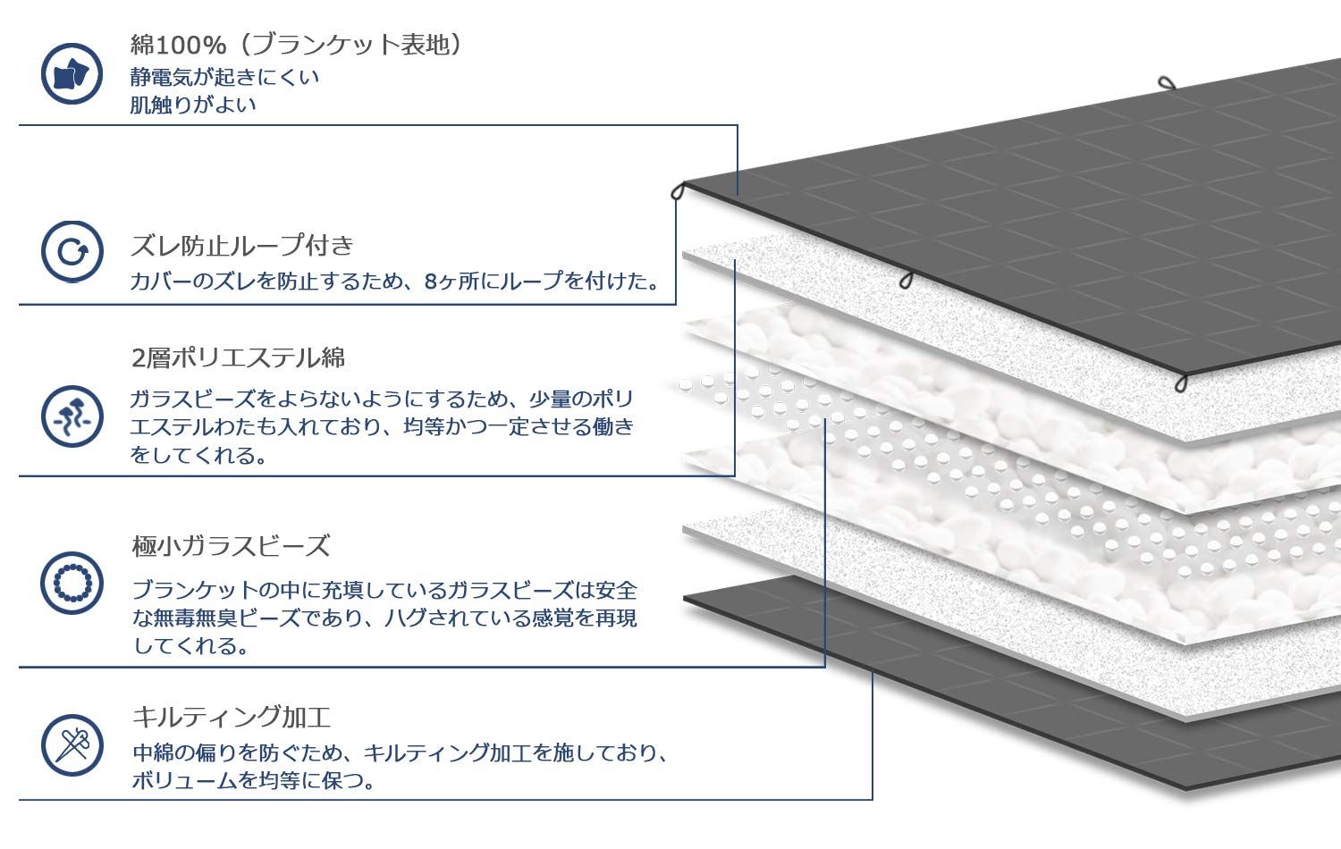 ?【機能性】抱かれている感覚を出すために人の体重の10~12%になるように設計されています。重みのある布団には、まるで繭の中にいるような包容感があり、興奮状態や生理喚起の状態を抑え、入眠・熟睡しやすくなります。