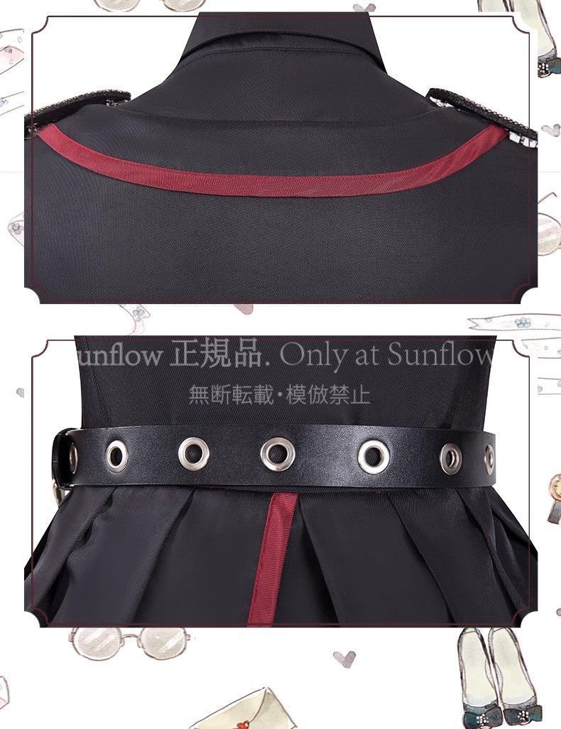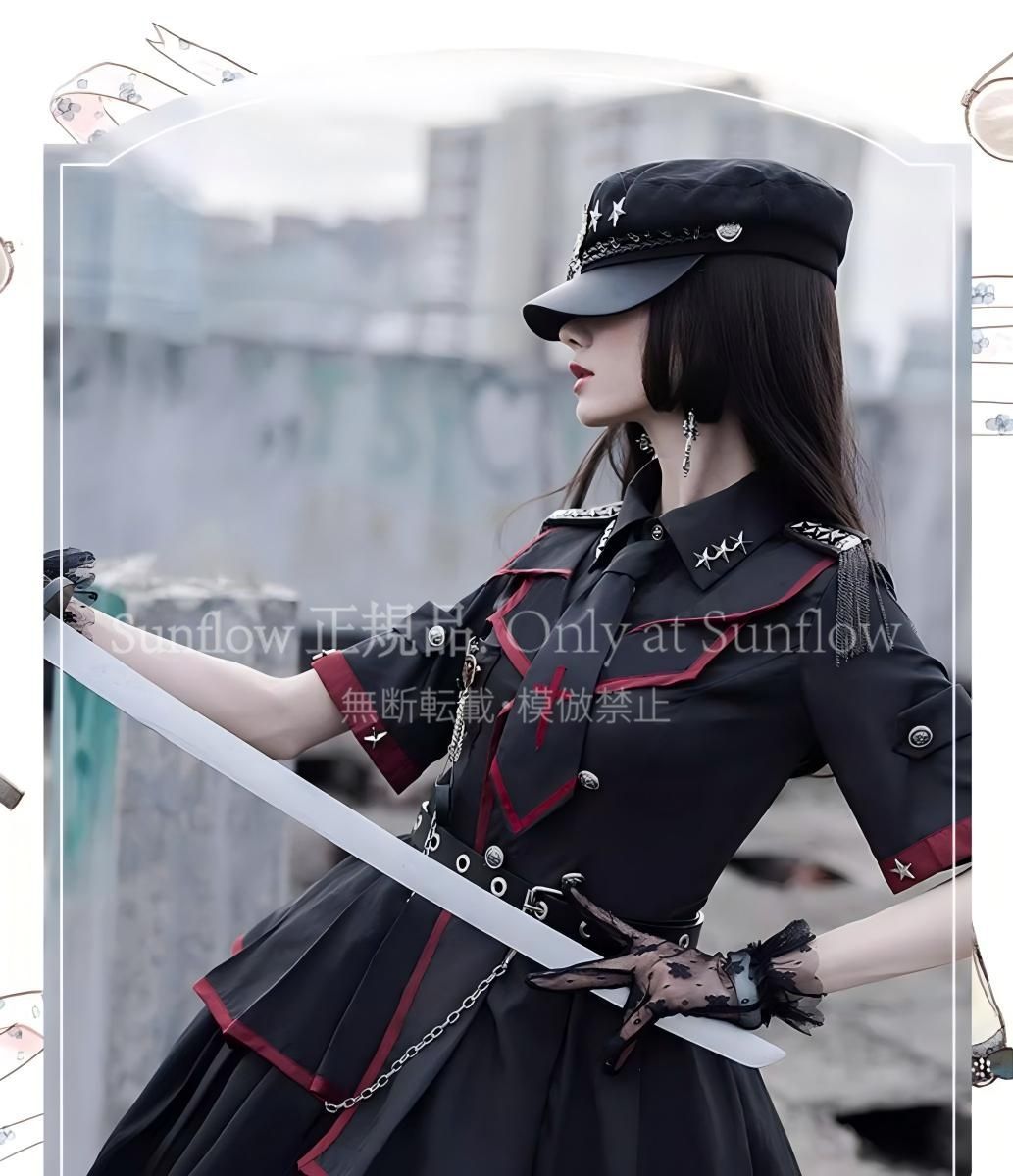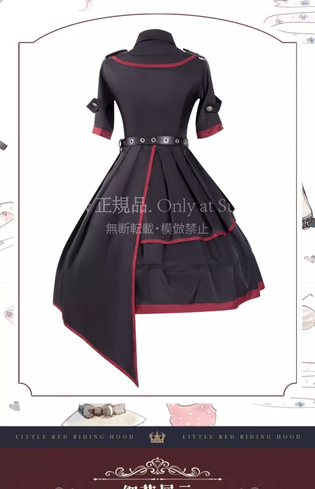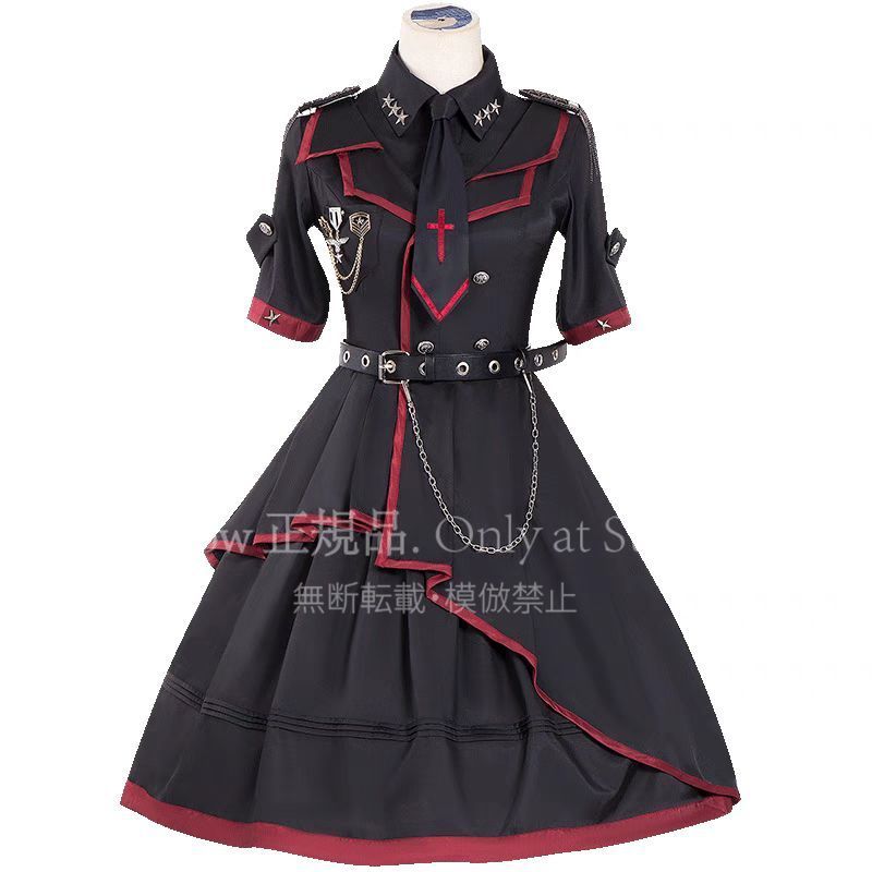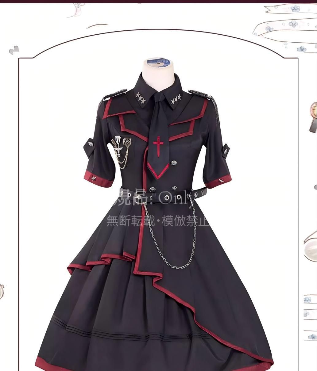 軍服風のクールなデザインに、ロリータ特有のフリルと赤黒のコントラストが映える魅力的な一着。五芒星やチェーン、ネクタイなどディテールまでしっかり再現されており、イベントや撮影会でも視線を集めます。