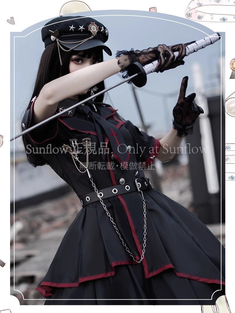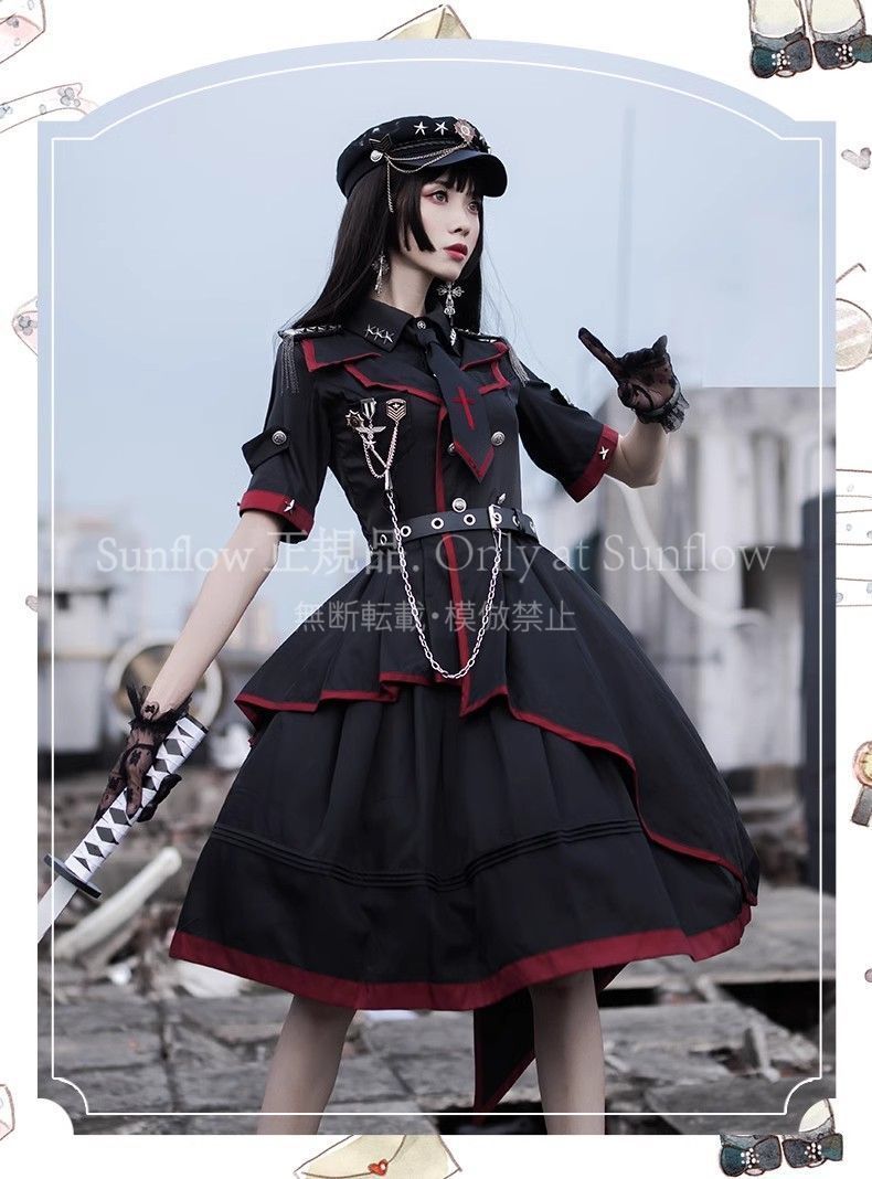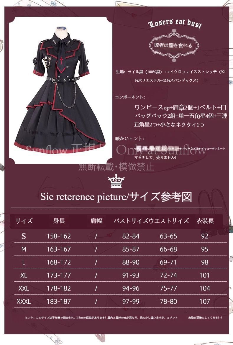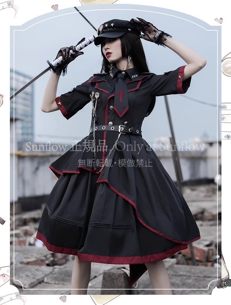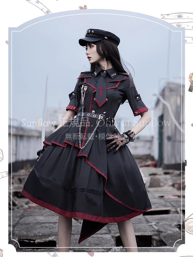 ♥ 副牌 敗者食塵 OPワンピース 軍服風 ロリータファッション フルセット ゴシック風 デザイン 十字架装飾 ブラック×レッド 制服風OP 豪華セット 仮装 イベント用 ハロウィン 撮影会に最適 CJS1212P062