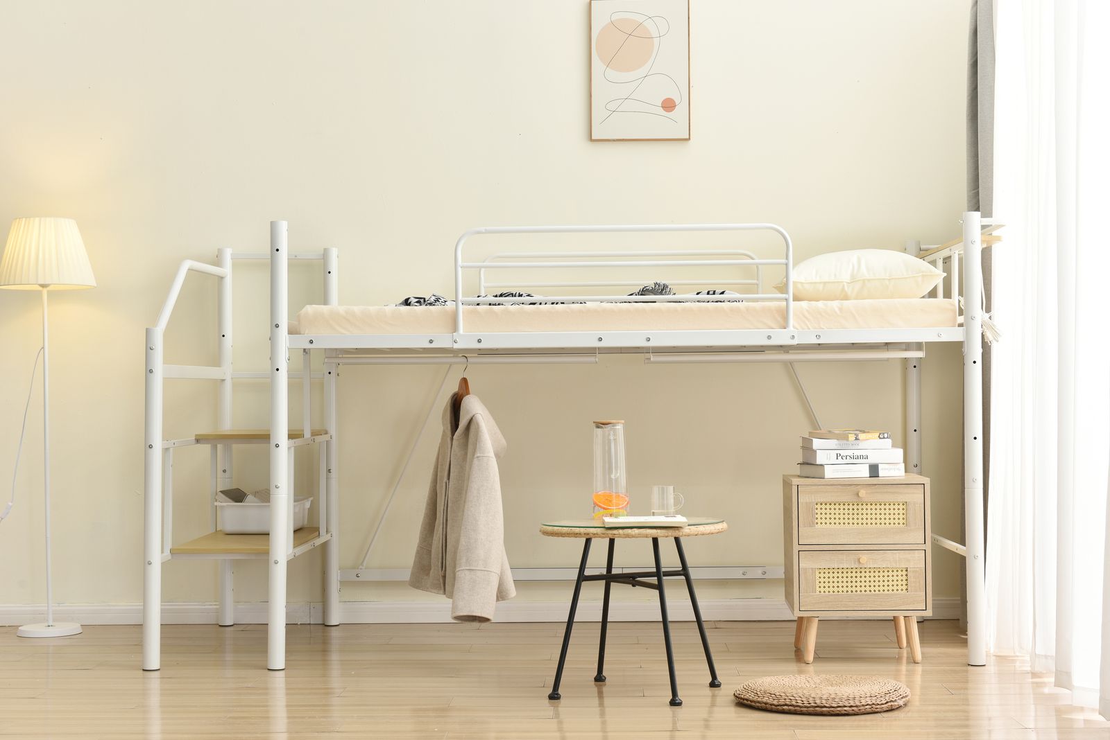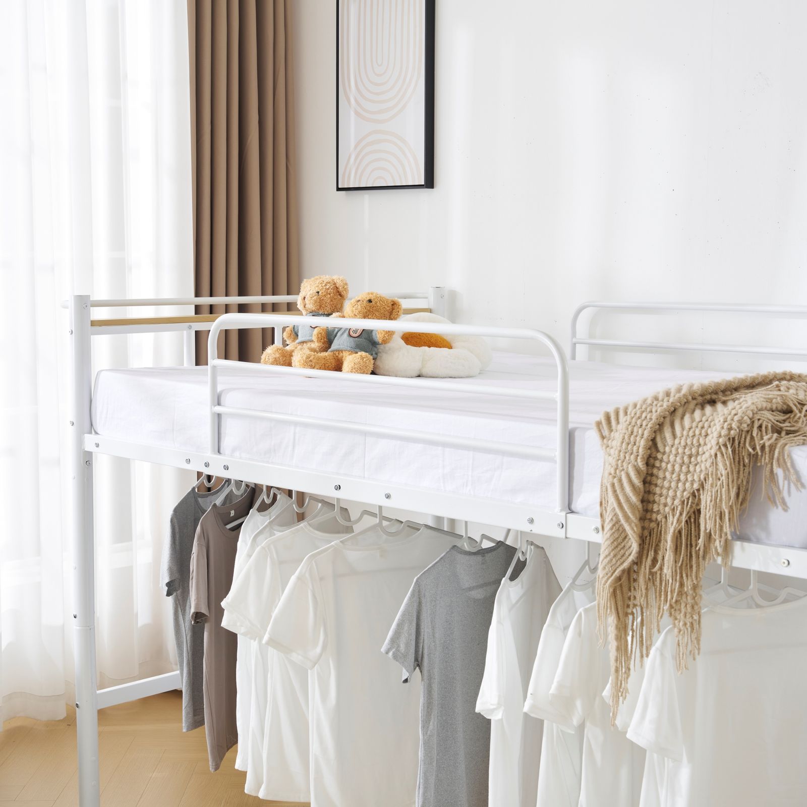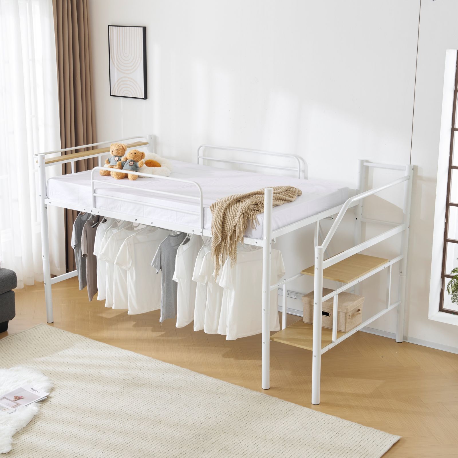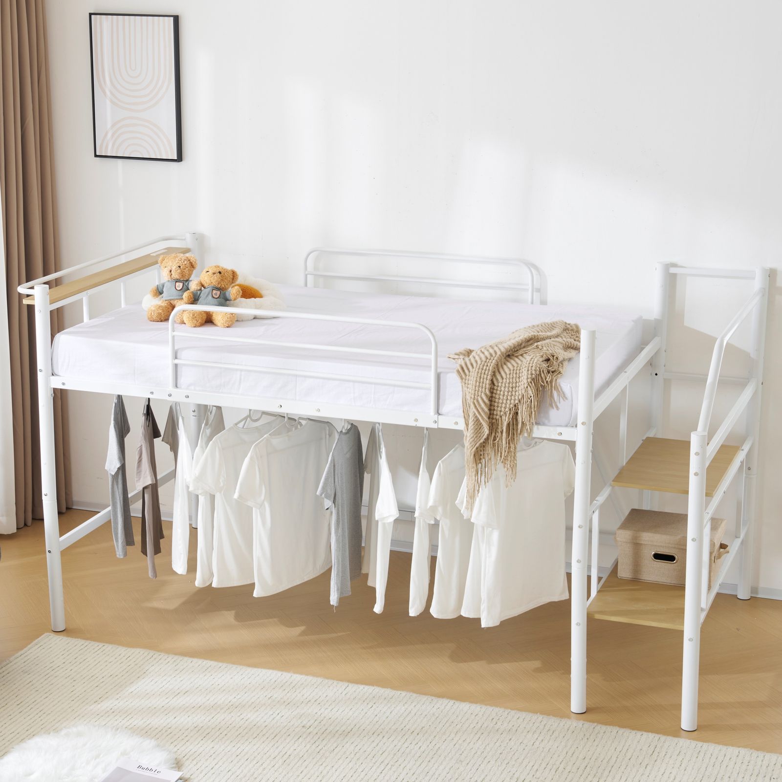 【様々なシーンで活用できるロフトベッド】アイディア次第でいろいろな使い方可能。 1.ベッド下を部屋干し空間として 2.ベッド下をクローゼット・収納スペースとして 3.座椅子を置くとのんびりくつろぎスペースに 4.別売りのシングルベッドを下に置けば二段ベッドに