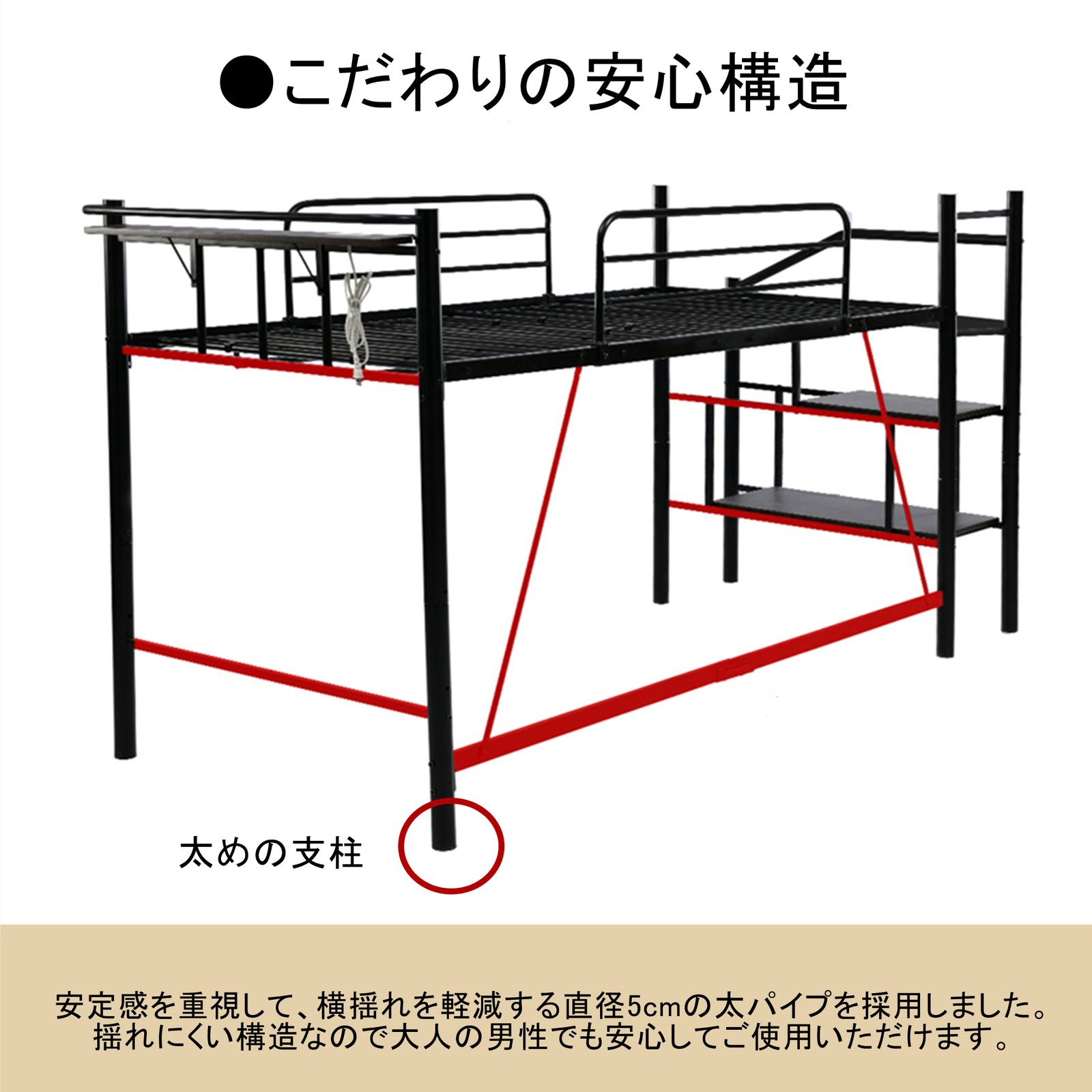 【安心の耐荷重150kg】 こだわりの安心構造 安定感を重視して、支柱に【直径5cmの太パイプ】を採用しました。揺れにくい構造なので大人の男性でも安心してご使用いただけます。