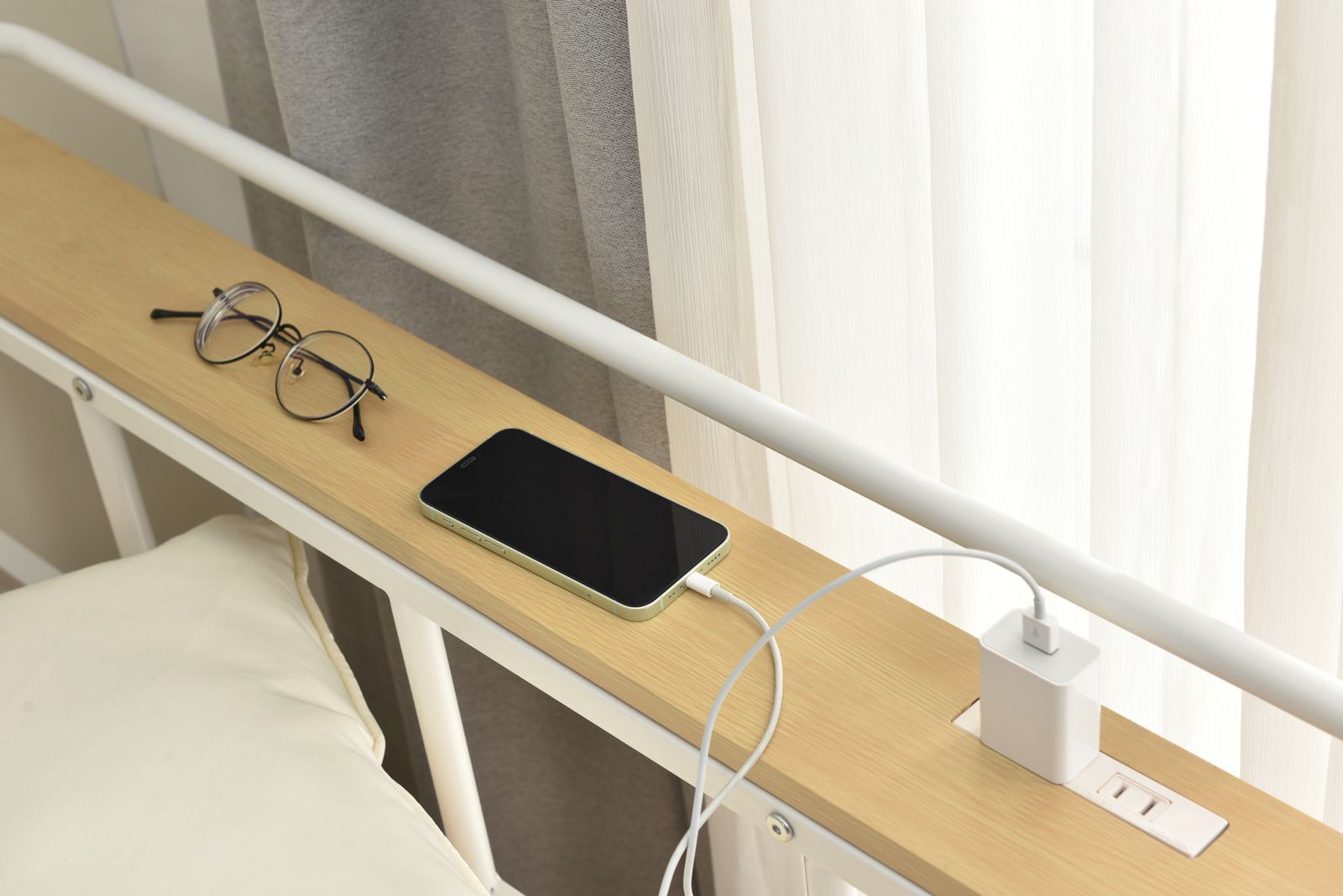 【コンセント付き宮棚】 ロフトの上でも快適に過ごすために必須の宮棚とコンセント。宮棚は時計や本、小物を置くのにとても便利。