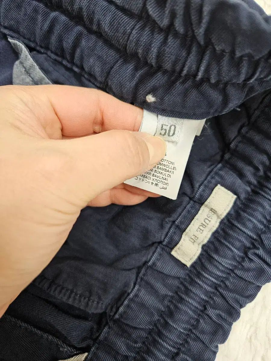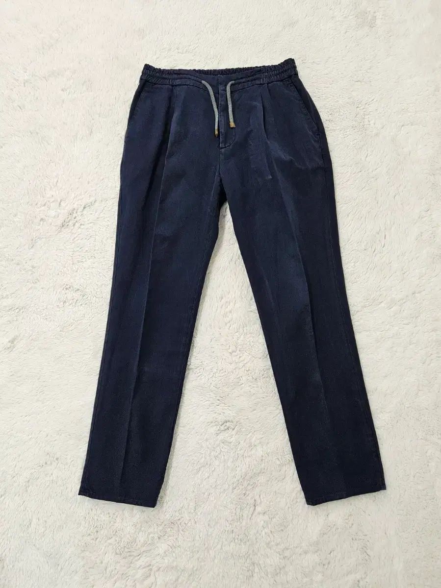 生地はコットンベースに見え、表面が荒れておらずウォッシュが過剰でないため、全体的に落ち着いたネイビーのトーンがよく生きています。明るかったりカジュアルなネイビーではなく、ニット・シャツ・ジャケットどんなものにも自然に馴染むクチネリ特有のカラー感です。
