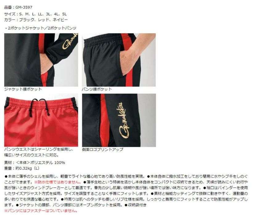 ●本体に薄手のシェルを採用し、軽量でライトな着心地であり高い防風性能を実現。●本体自体に撥水加工をしており簡易に水やシブキをしのぐことができます。※防水仕様ではありません。●薄手生地という特徴を活かし本体自体をコンパクトに収納できるため、天候が読みにくい釣行や風が強いときのウィンドブレーカーとして最適です。春先の少し肌寒い時期や風が強い場所では強い味方になります。●袖口はバインダーを使用したサイズアジャスト方式を採用。サイズを調整することなく手首にフィットします。●素材と機能カッティングで抜群に動きやすく、運動量の多い釣りでも快適な着心地です。●衿周りは肌へのタッチも優しいリブ仕様を採用。しっかりと首周りにフィットすることで防風性能がアップします。●ジャケットの腰部、パンツ腰部にはオープンポケットを採用。※パンツにはファスナーはついていません。